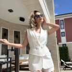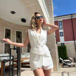 Дамски сет от две части – блейзер и къси панталонки “Odessa” е едно сезонно изкушение, изработено от лен и памук.