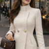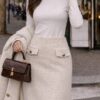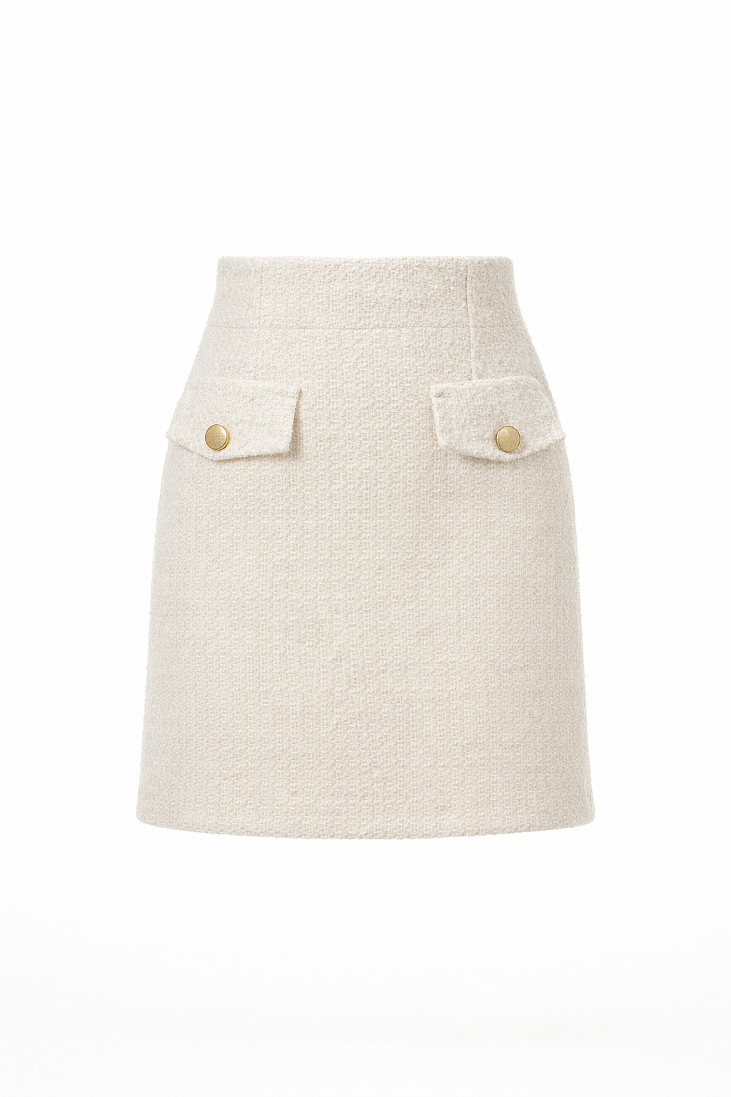 Пола в екрю цвят, изработена от вълнено букле с еластична подплата. Капачета със златисти копчета и скрит цип в страничен шев. Комбинирай с палто „Liza“