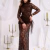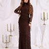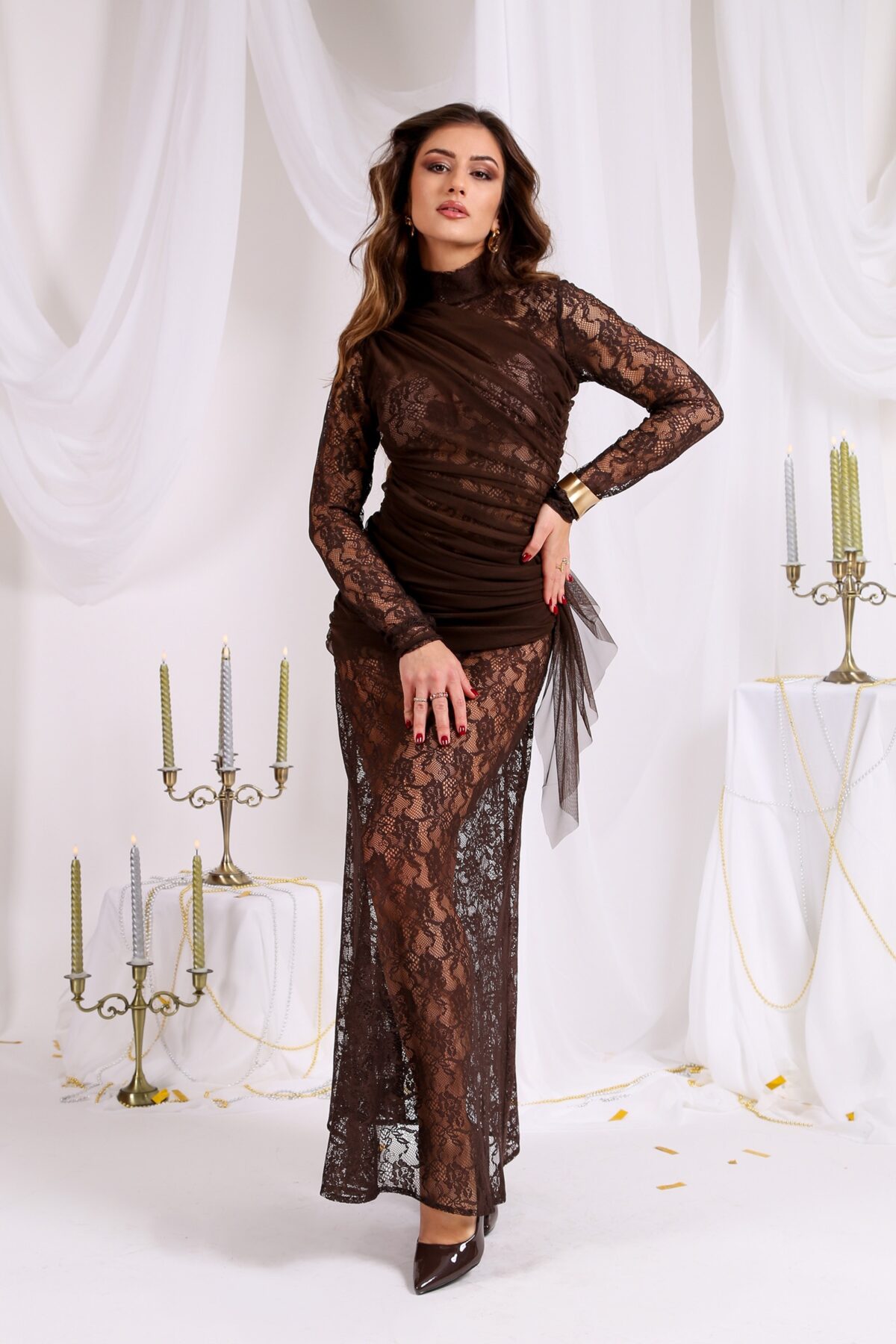 Луксозна бутикова рокля, създадена за жени, които ценят драматичния силует и финия детайл. Моделът е изработен от елегантна дантела в дълбок шоколадов тон, която ефектно подчертава фигурата. Горната част впечатлява с изящно драпиране, висока яка и прозрачни дантелени ръкави.