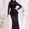Впечатляваща дълга рокля, изработена от фина черно-сива дантела, която комбинира елегантност с модерен силует. Материята е богата на детайл, създава деликатна прозрачност и придава изтънчена структура на тялото.