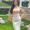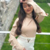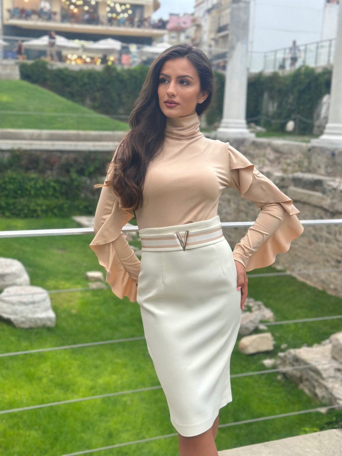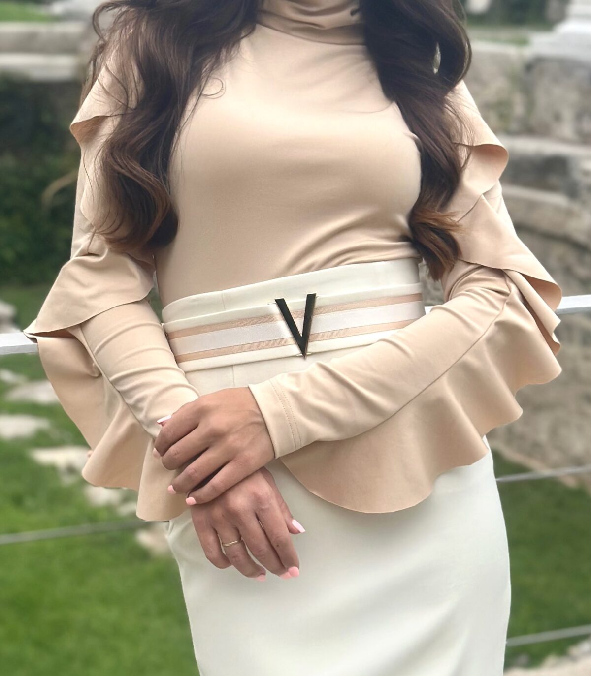 Колан изработен от плътна материя и рипс с тока “V” елемент, закопчаващ се с малки копченца.