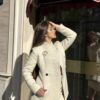 Дамско двуредно палто в екрю цвят, изработено от вълнено букле. Ефектна вталена кройка със златисти копчета на талията.Закопчава се и със скрити копчета непосредствено до яката.