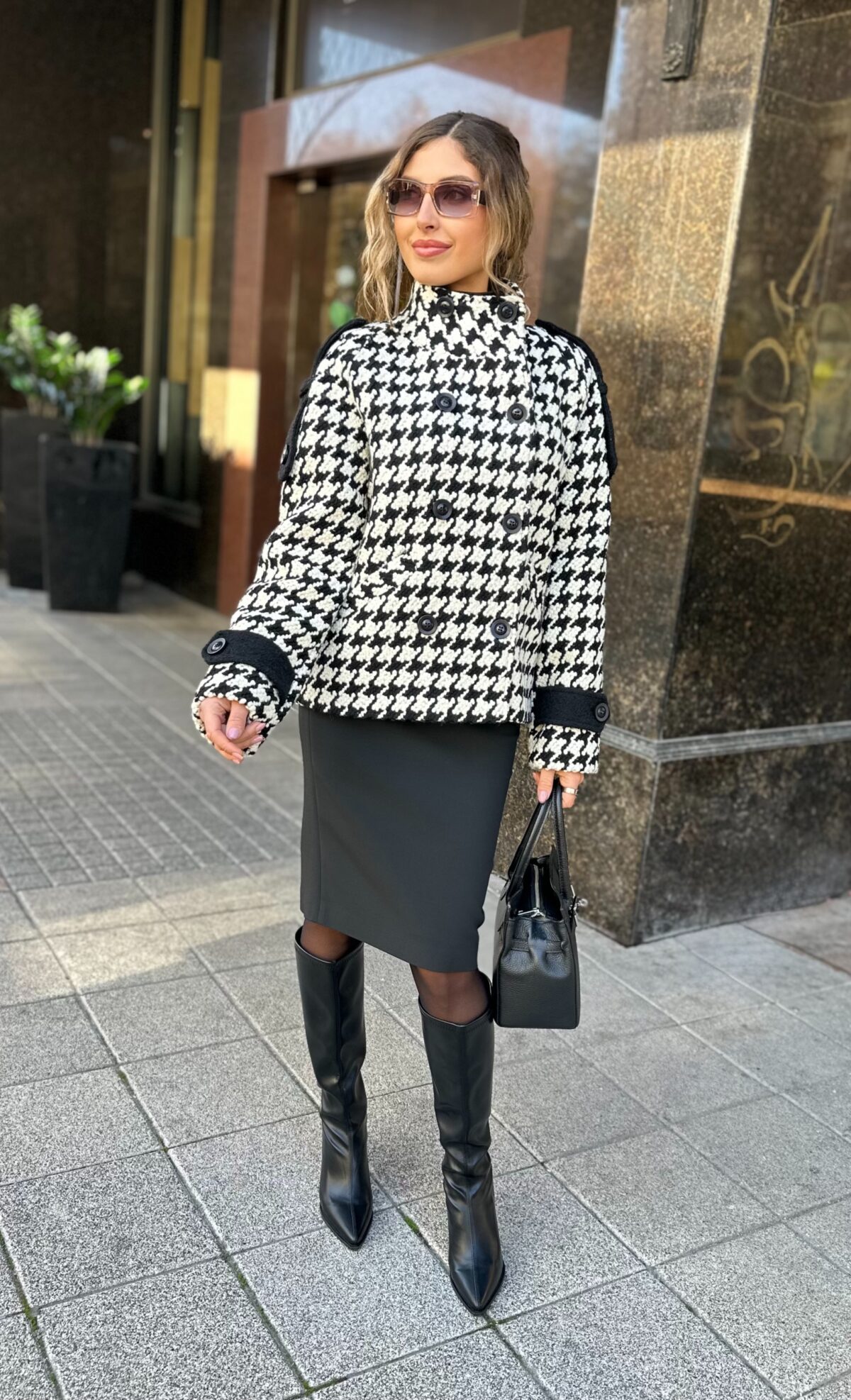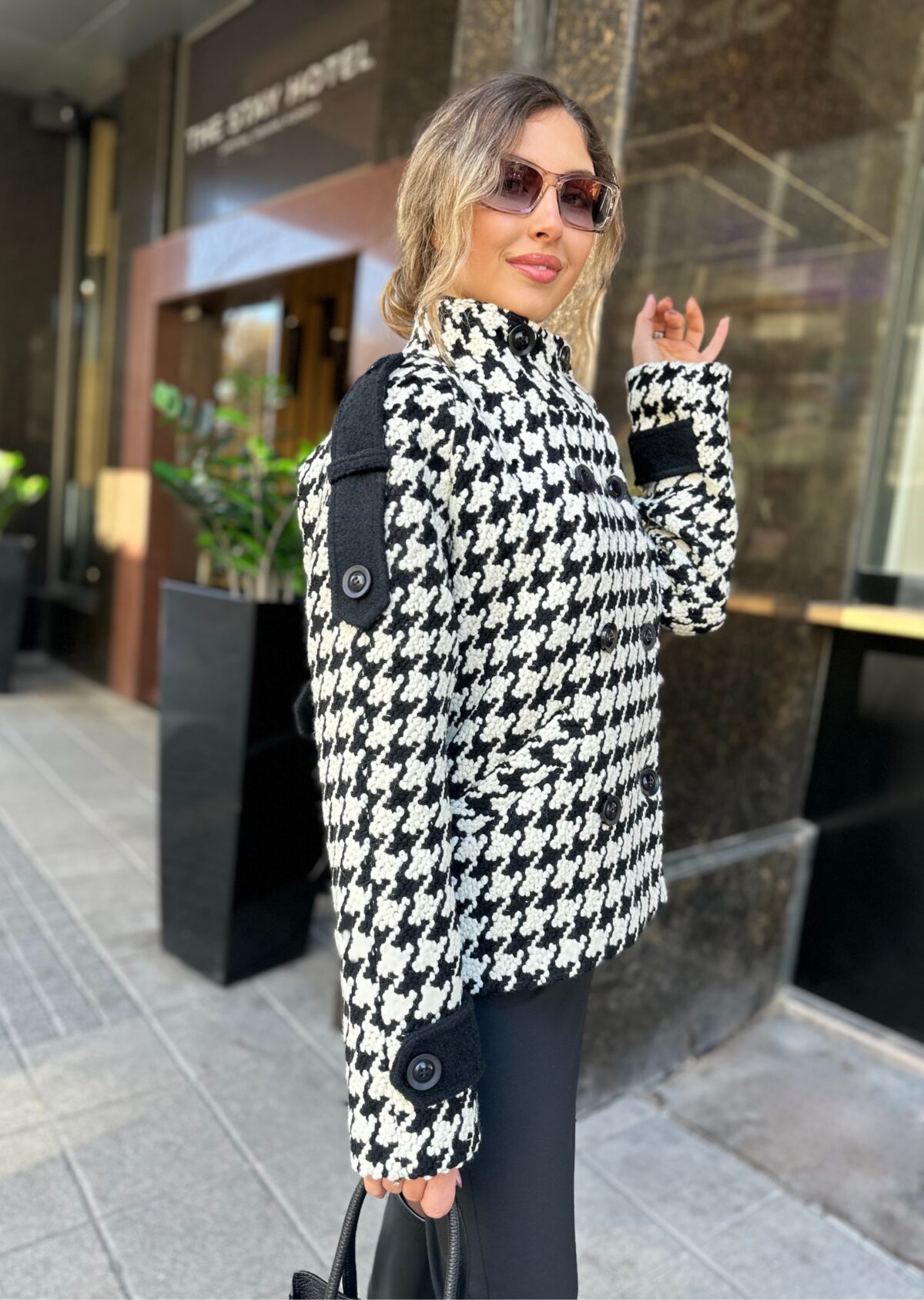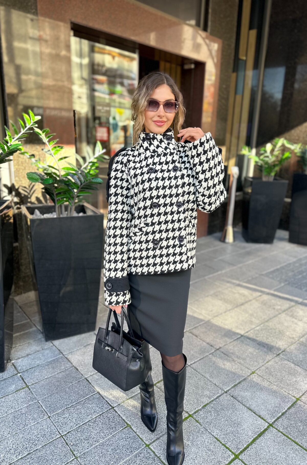 Елегантно вълнено палто в черно-бял пепит десен, създадено за дами, които ценят качеството и класиката. Моделът е с реглан ръкав, осигуряващ комфорт и мека, изчистена линия на раменете.