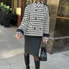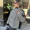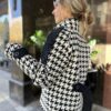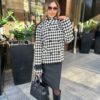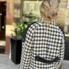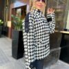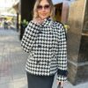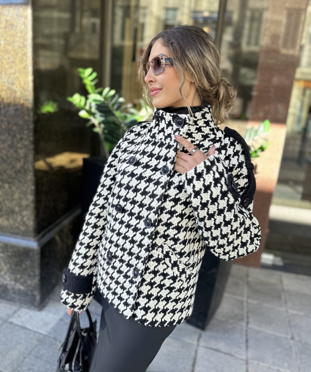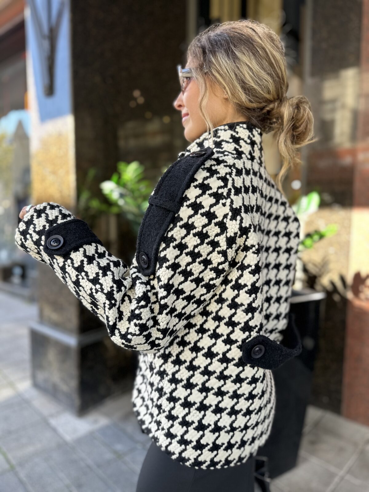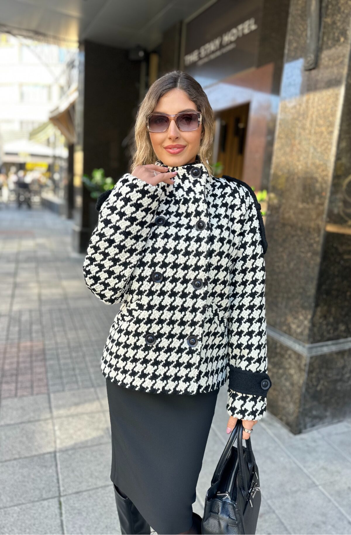Елегантно вълнено палто в черно-бял пепит десен, създадено за дами, които ценят качеството и класиката. Моделът е с реглан ръкав, осигуряващ комфорт и мека, изчистена линия на раменете.