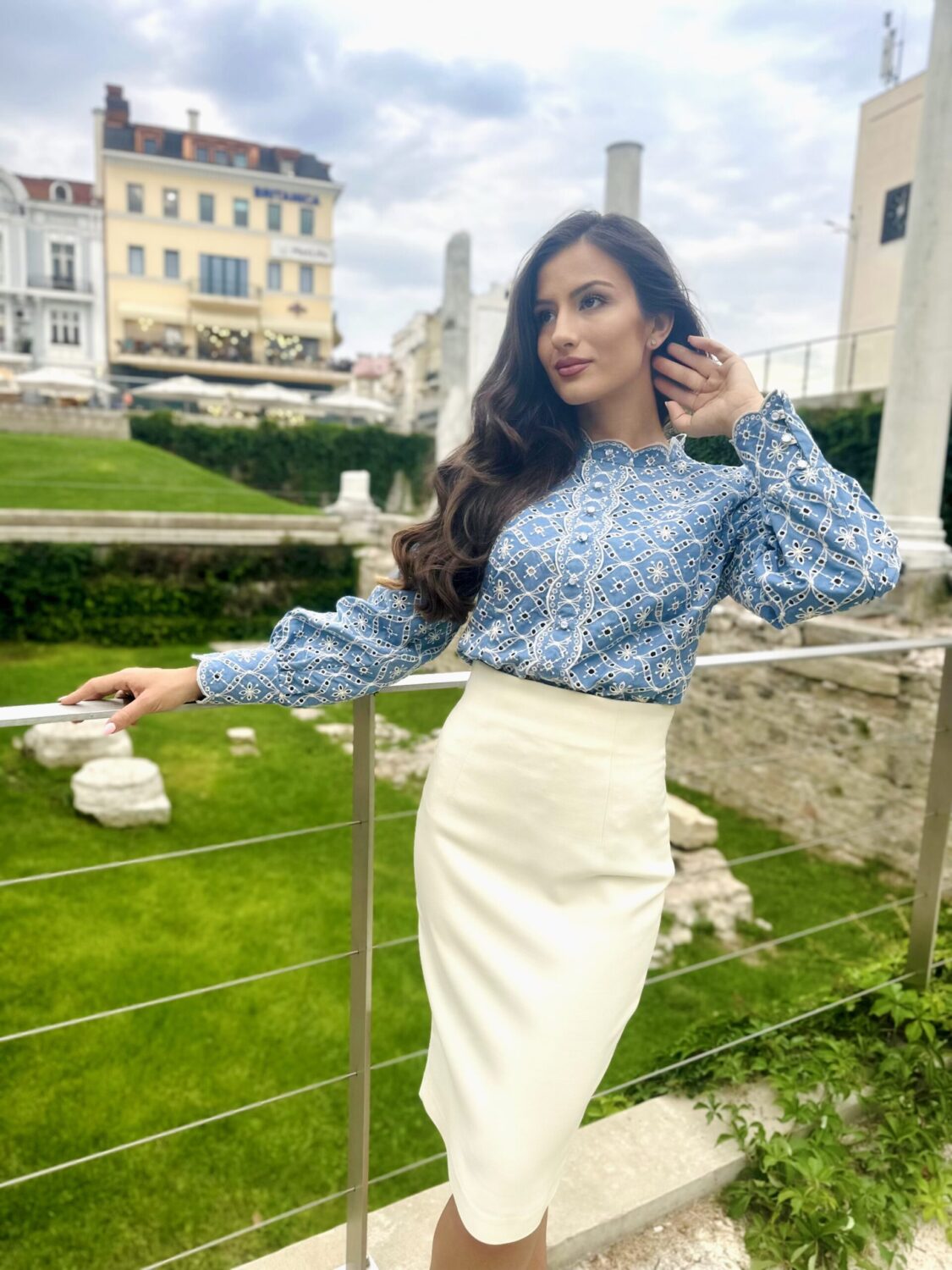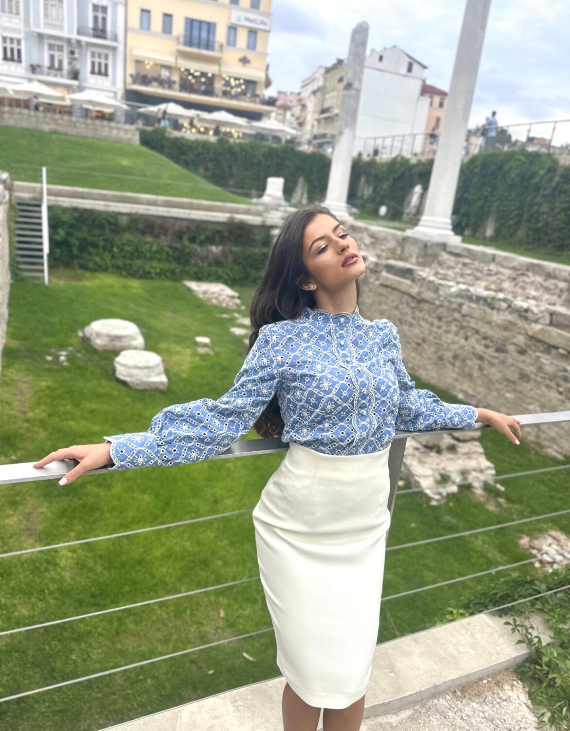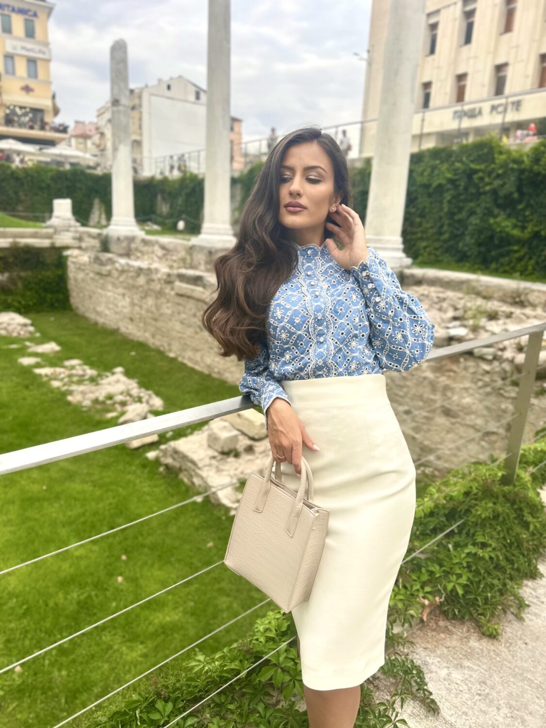 Моделът е висок 167см. с размери 85/65/92 и позира с размер “XS”