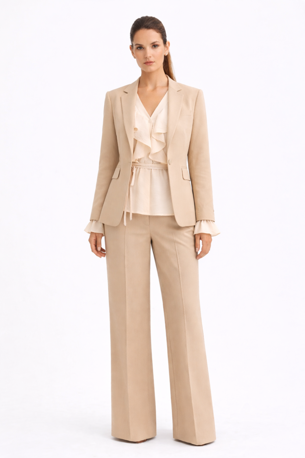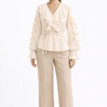 Блузата е с красиви, обемни къдрици и V-образно деколте, закопчаваща се отпред, с акцент на талията чрез колан от същия плат