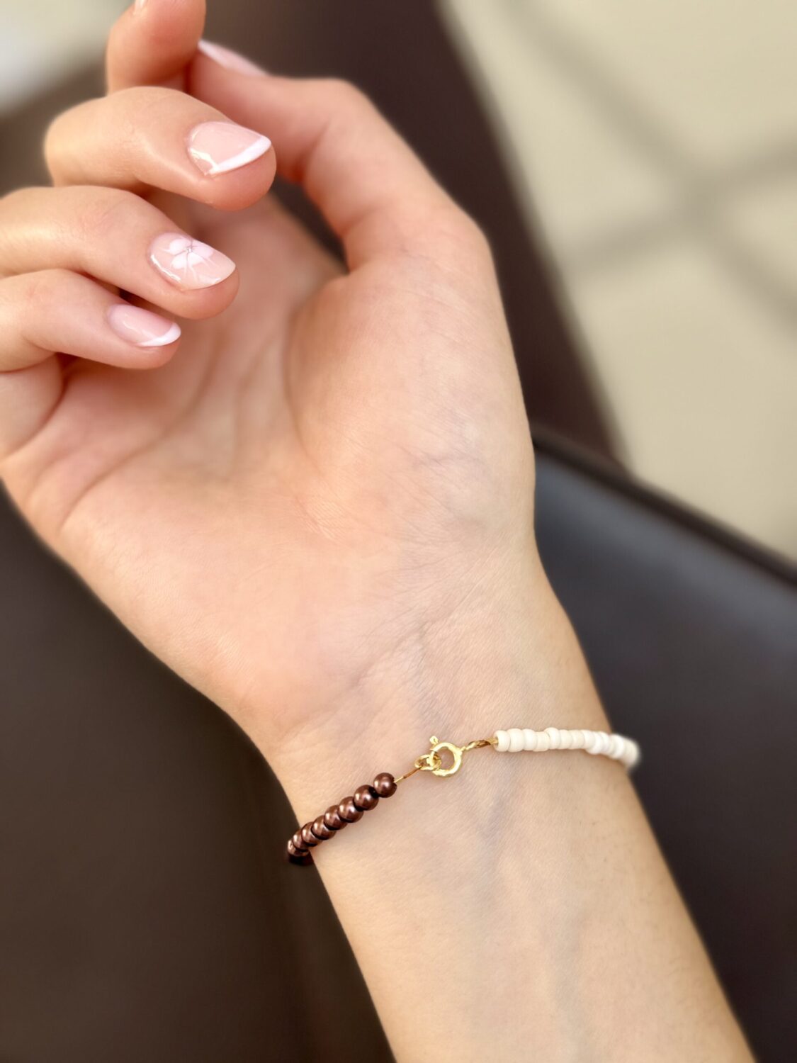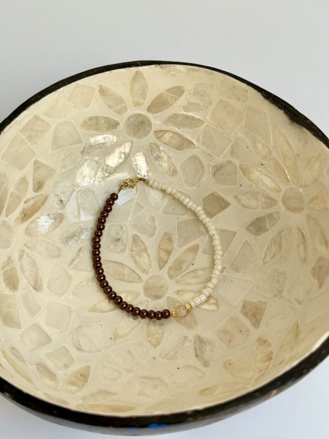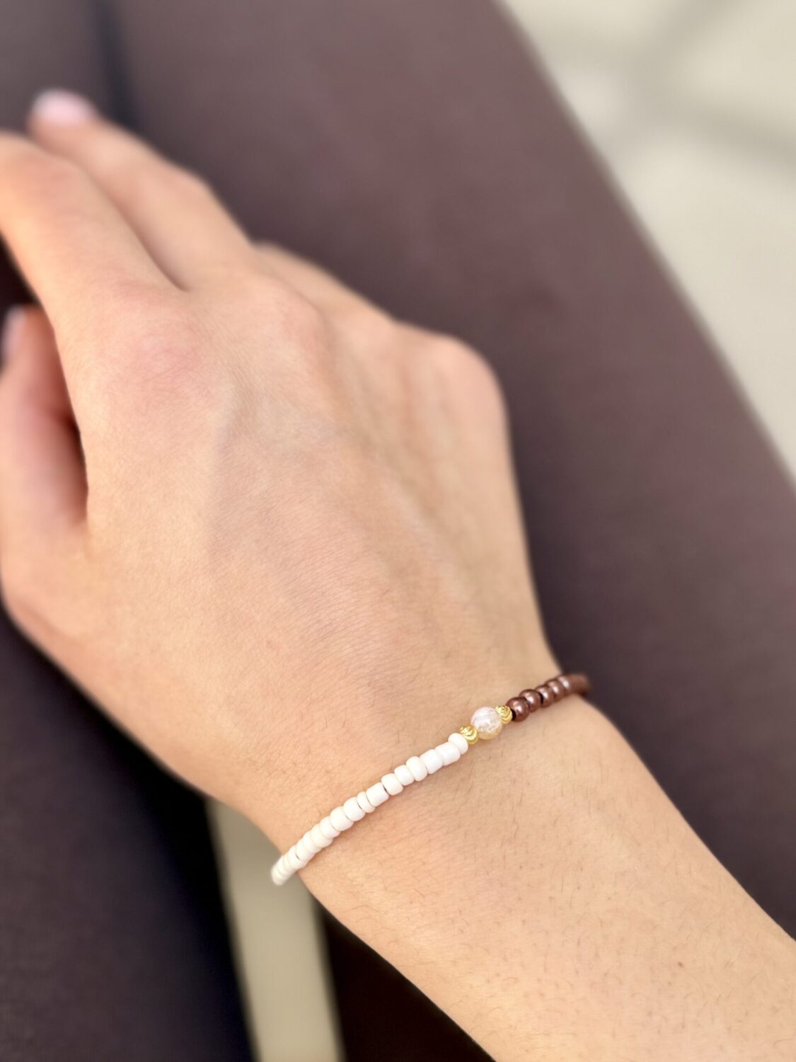 Нежна ръчно изработена гривна с висококачествени стъклени мъниста, съчетани с позлатени елементи. Завършена с позлатена сребърна закопчалка.
