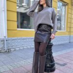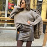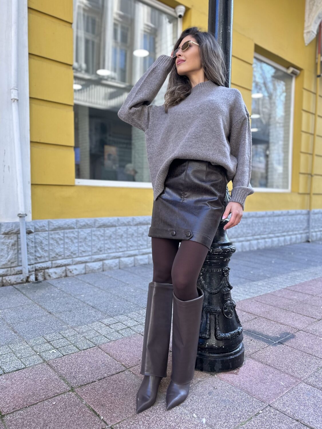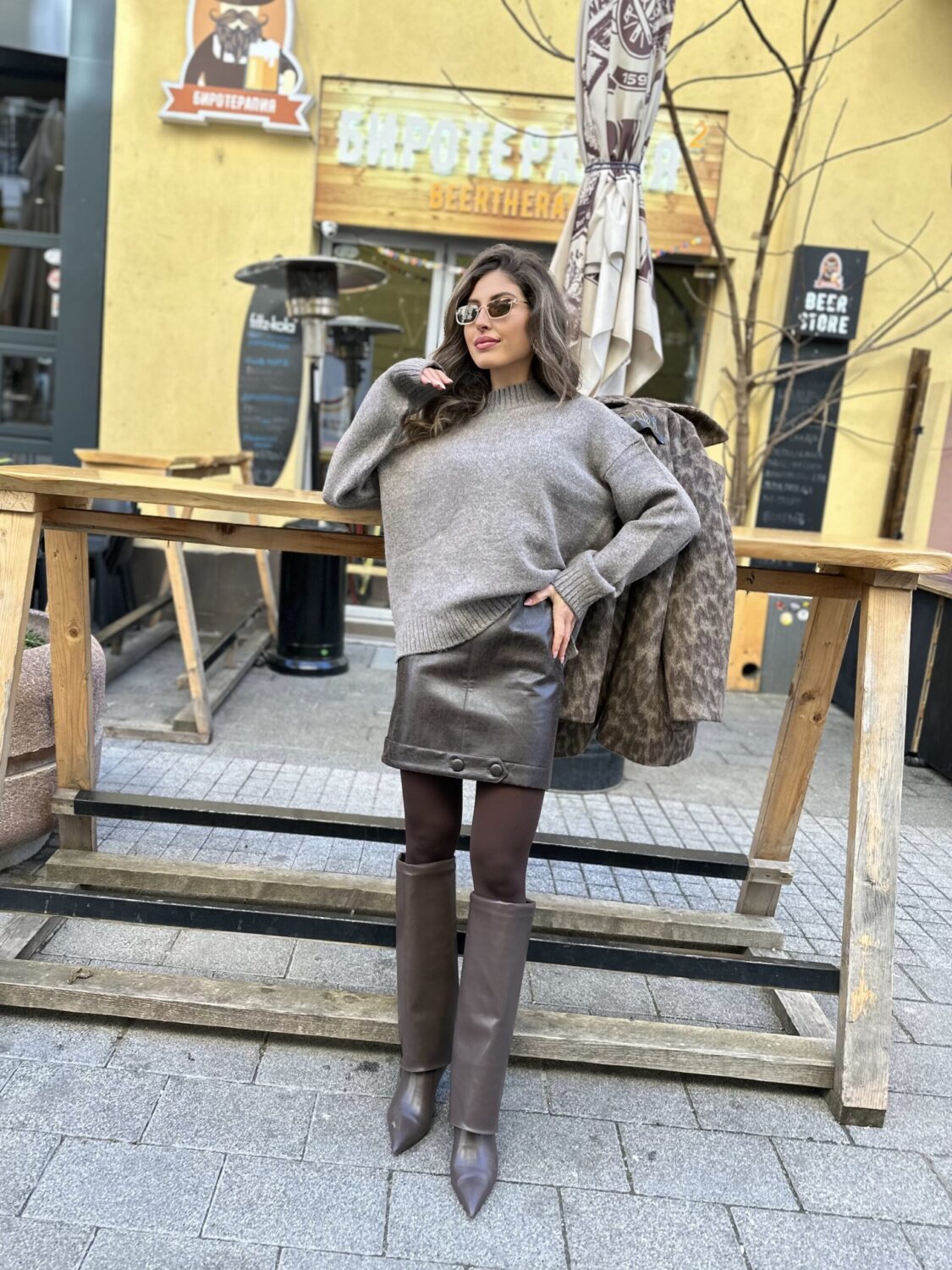 Кожена пола с асиметричен колан, завършващ с облечени копчета при подгъв. Леко състарен ефект на кожата придава уникален характер.