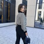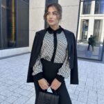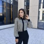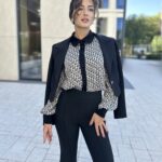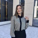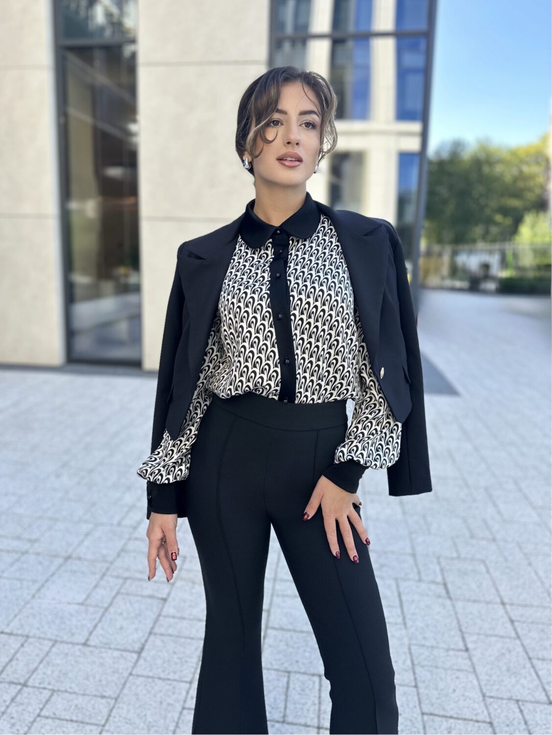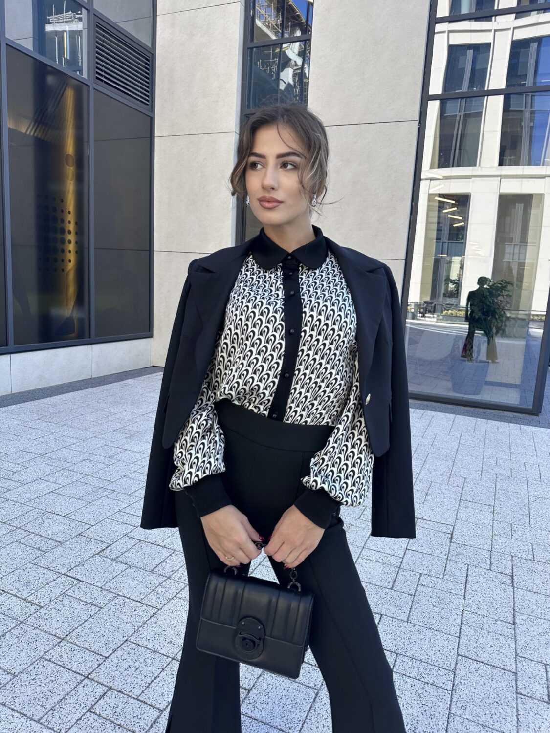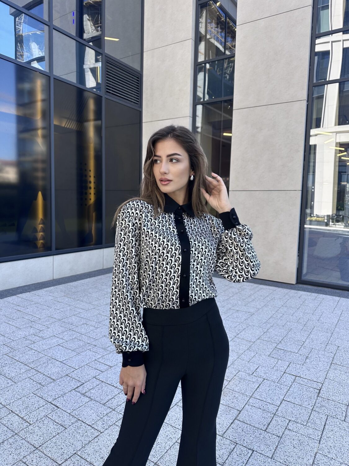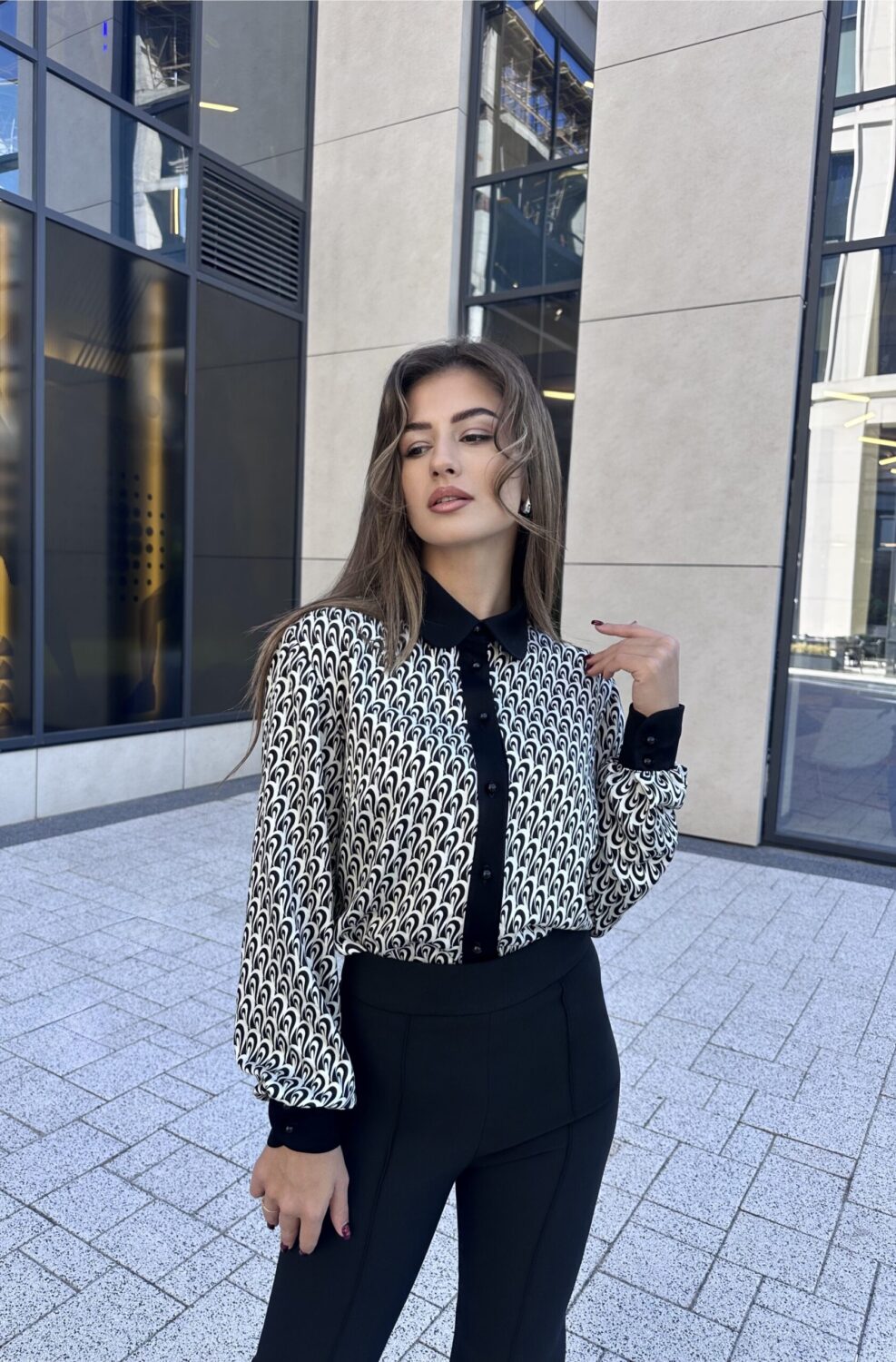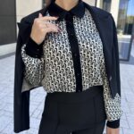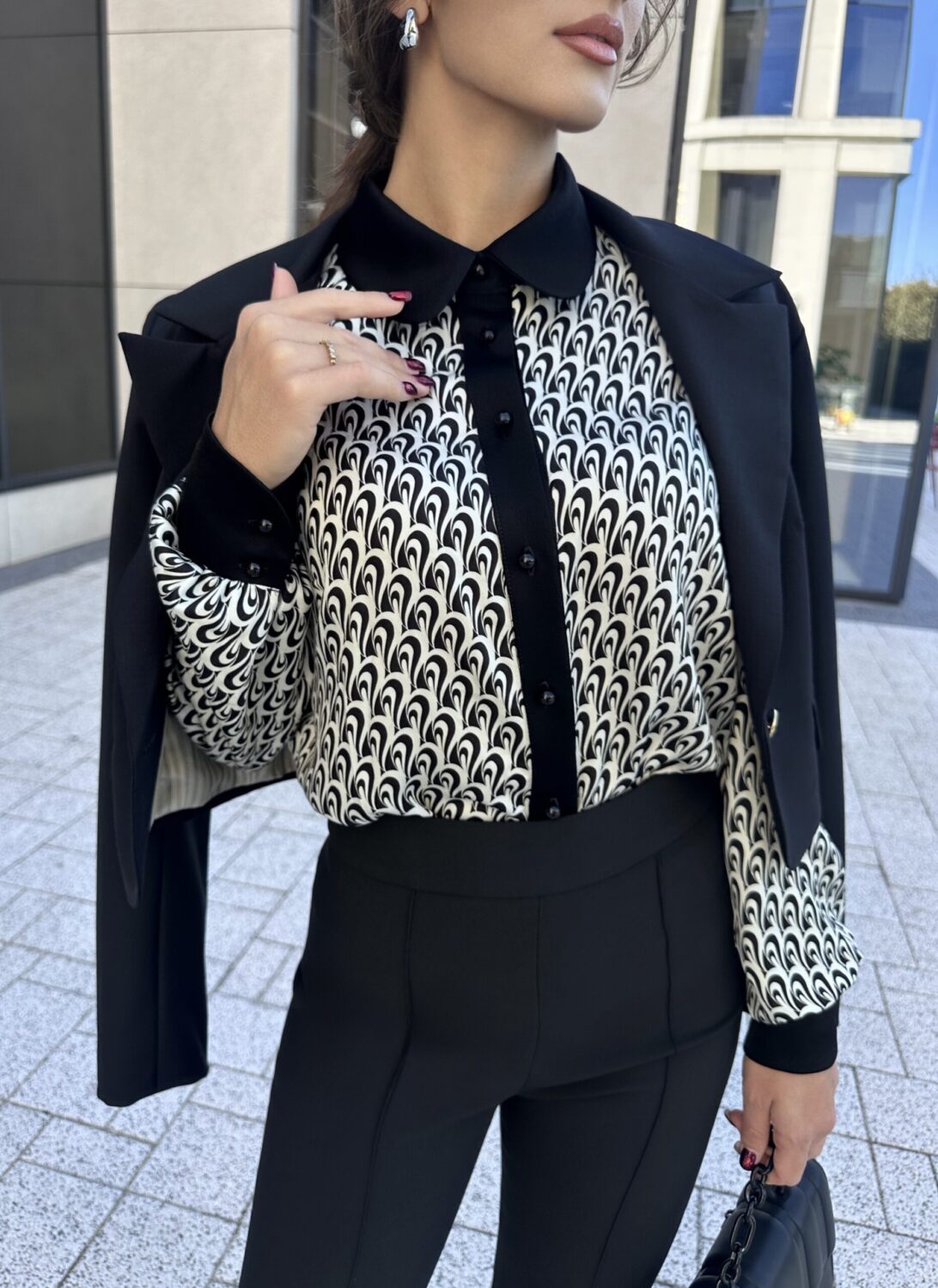 Черно-белият десен е хармонично допълнен от сатенени акценти – изчистена яка, копчета и маншети, които създават усещане за модерна изисканост.