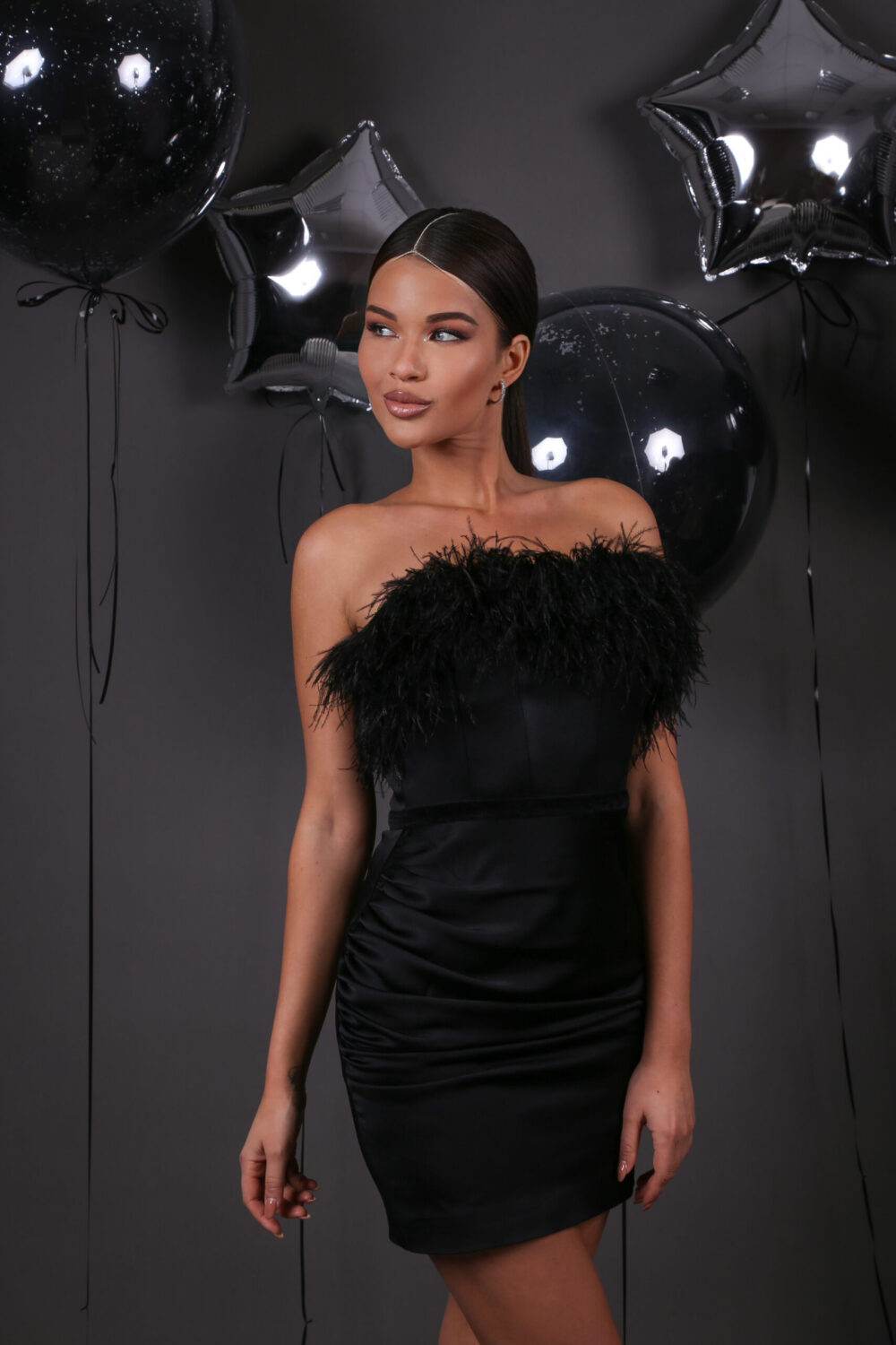 Елегантно съчетание на щраусови пера в комбинация с вискозен сатен. Такава е новата рокля “Angelina”