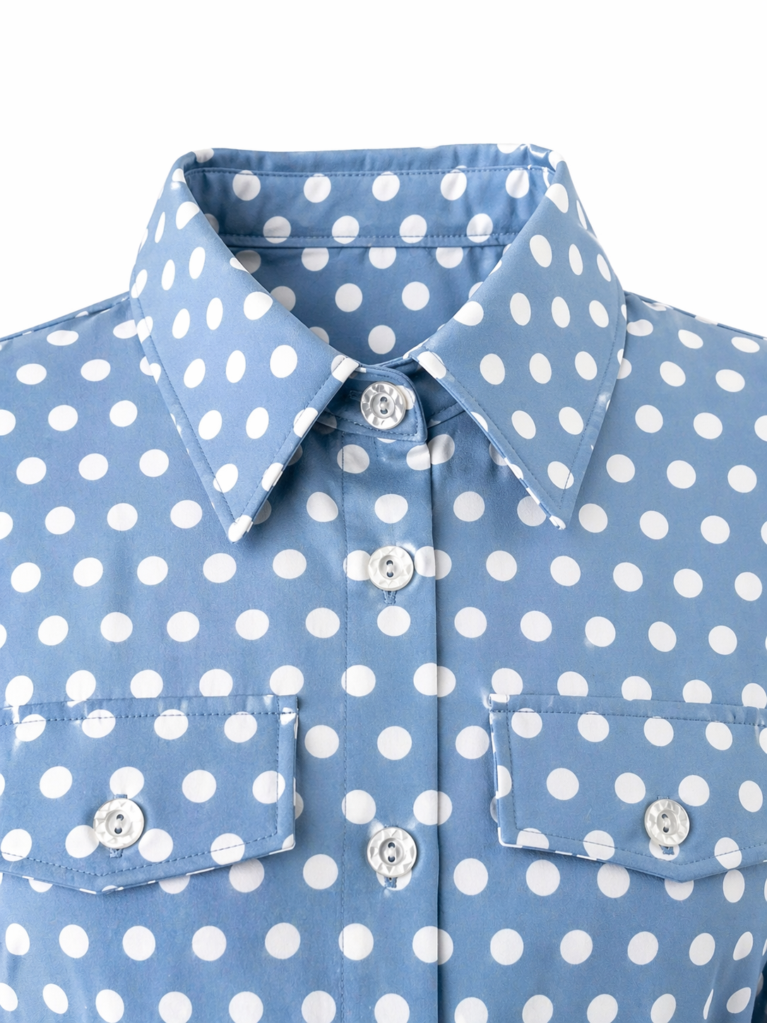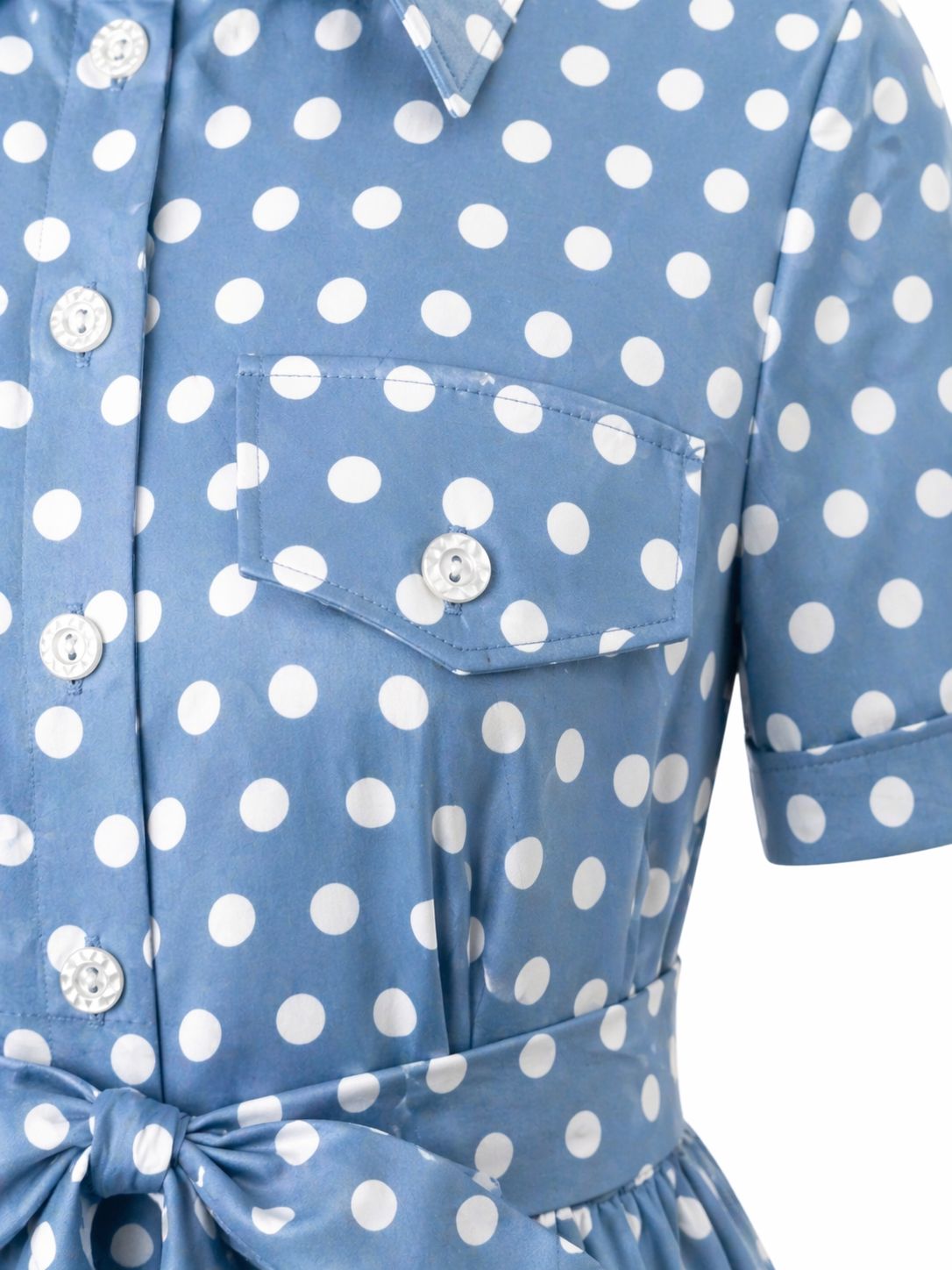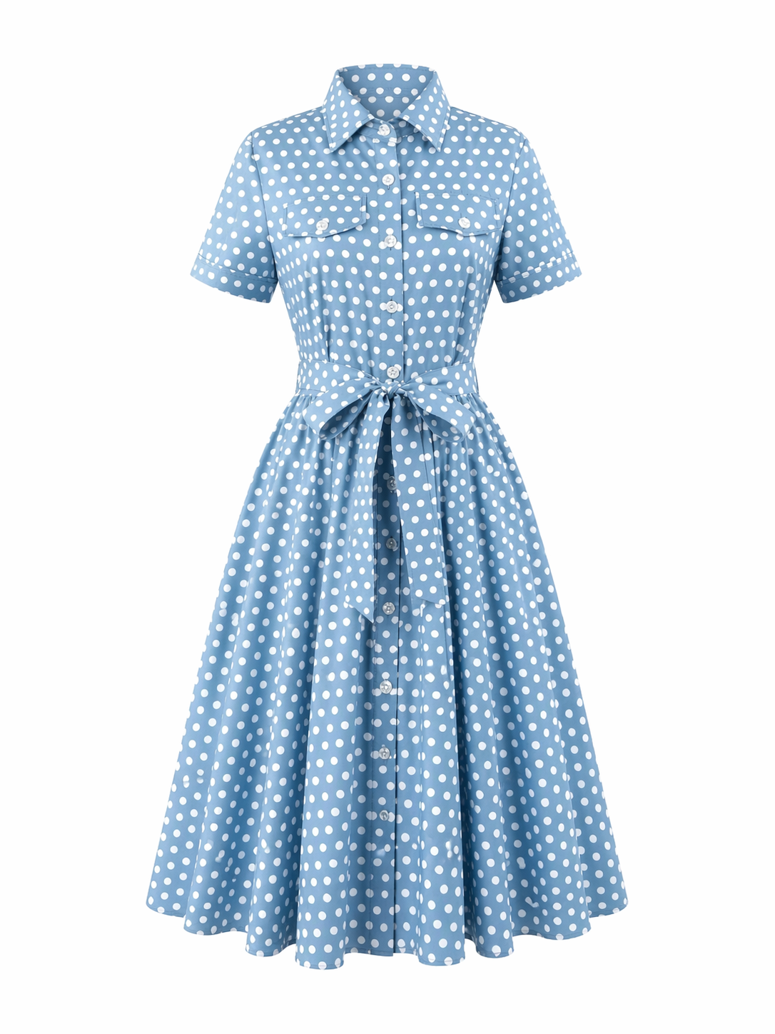 Роклята е в миди дължина с клош кройка, която създава красиво движение и лекота. Десенът на точки добавя фин и романтичен акцент, а синият цвят прави модела свеж и лесен за комбиниране.