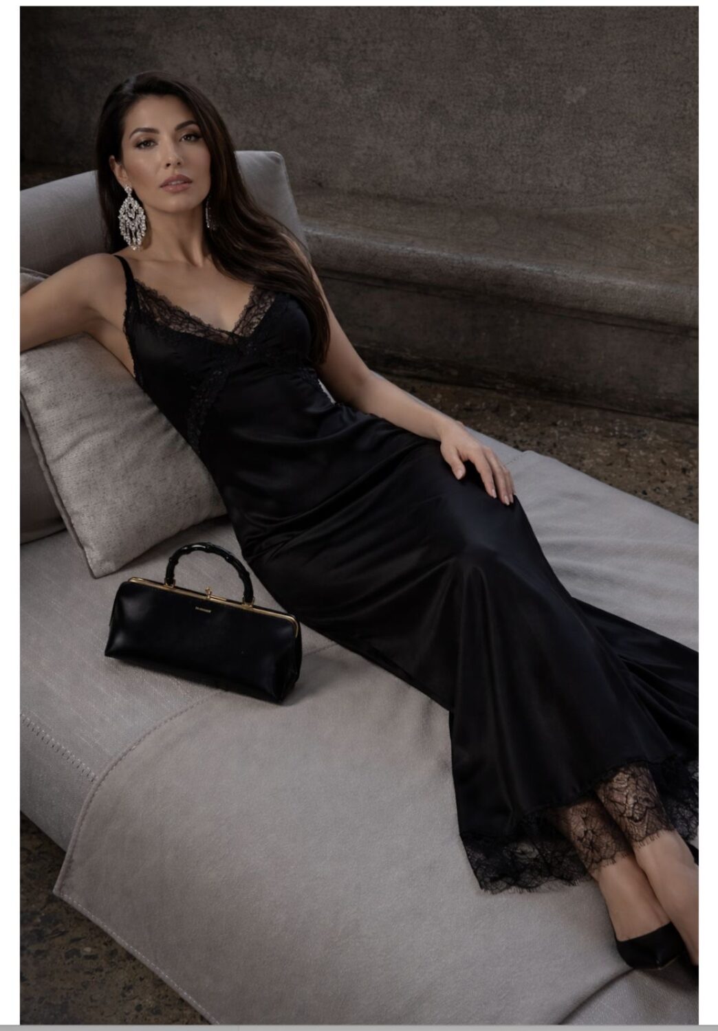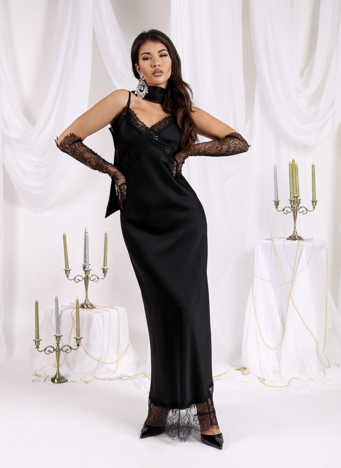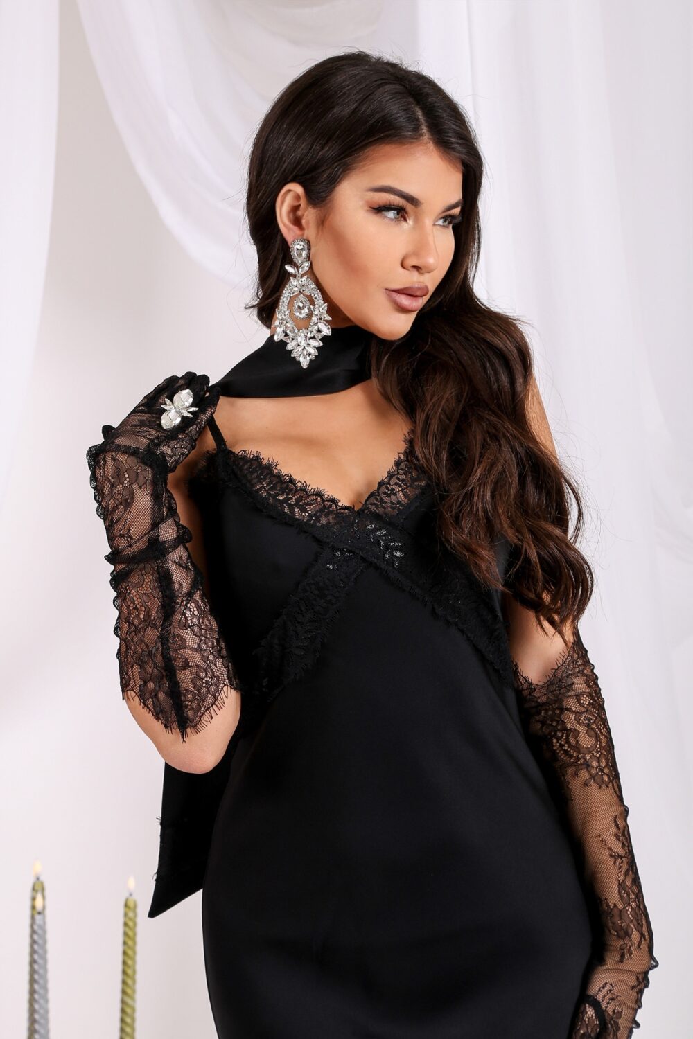 Открийте съвършенството в детайла с рокля „Black Amara“ – изящна комбинация от черен сатен деликатна  дантела.