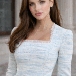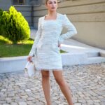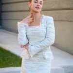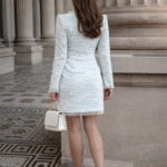 Елегантна рокля съчетаваща изчистена линия и финес в детайла. Изработена от първокласен светъл туид с преплетени светлосини нишки, тя впечатлява със своята изисканост и усещане за лукс още при първия допир.