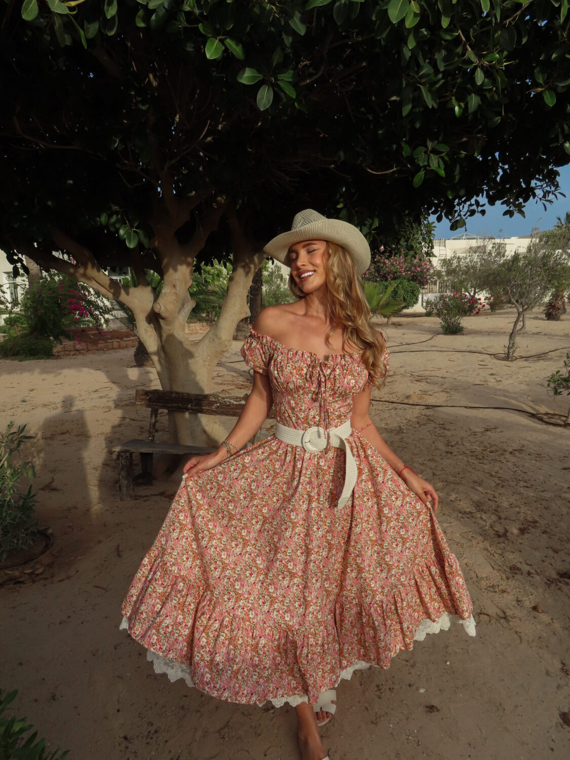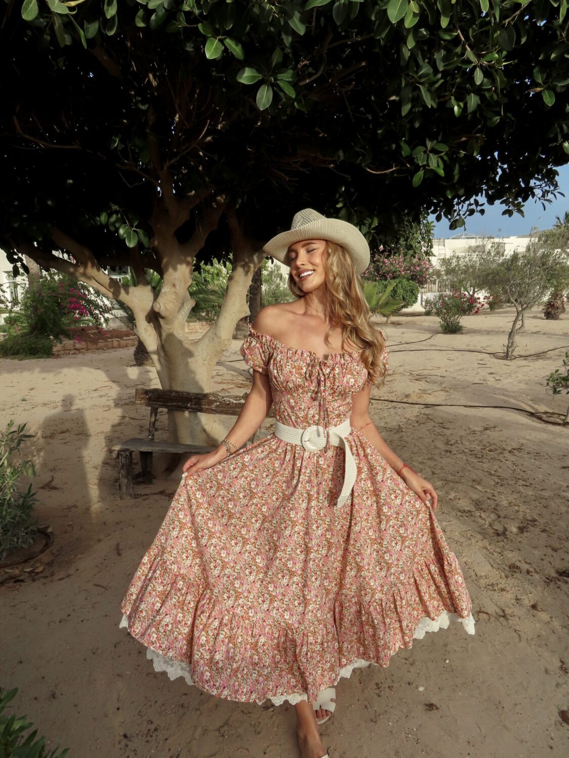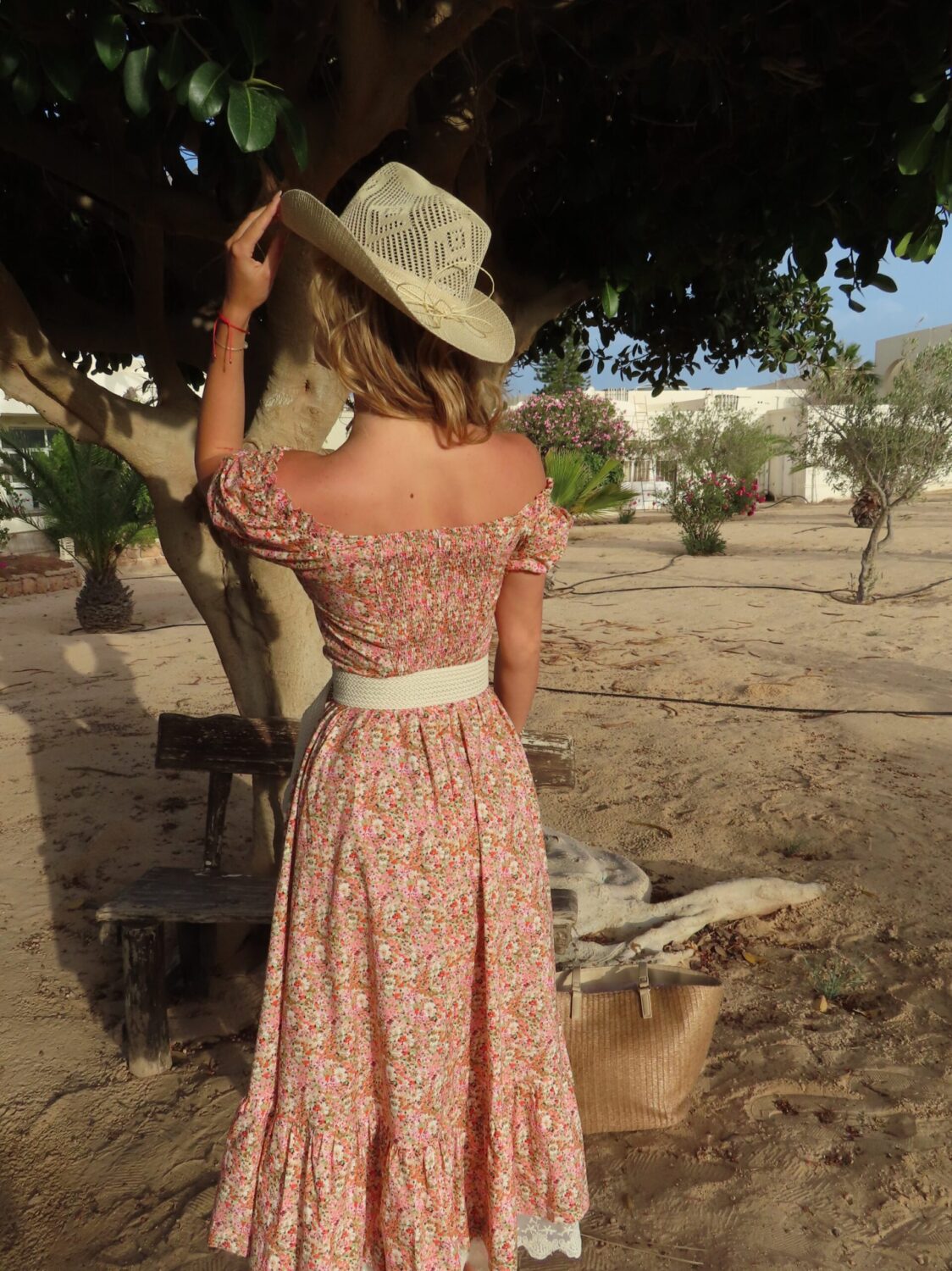 Роклята Dolce Fiore е създадена за онези слънчеви дни, в които мечтаеш да се изгубиш в ароматна градина. Изцяло изработена от 100% памук, тя съчетава ефирен силует с деликатен флорален десен и нежни детайли като памучна дантела по подгъва и ръчно връзване отпред. Горната част е с открити рамене и еластичен гръб за максимален комфорт, а талията е подчертана с красив плетен колан, който може да откриете в категория “Аксесоари”