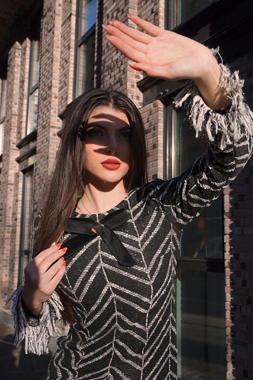 * Акцента е в ръкавите: дълги разнищени ресни с ръчно зашити верижки.