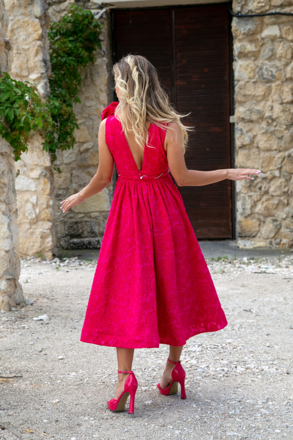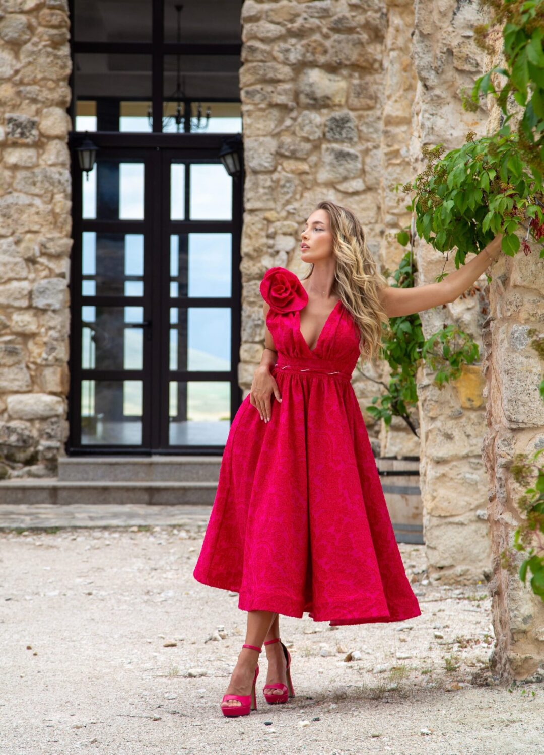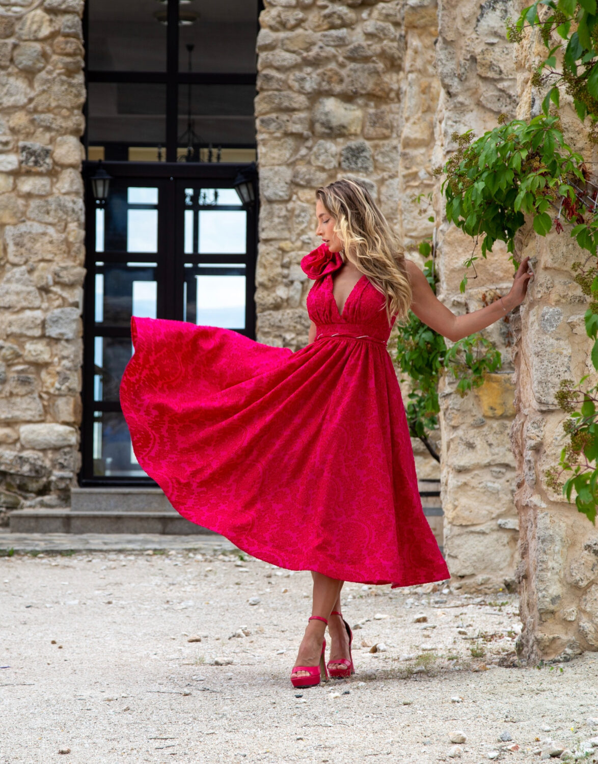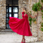 Ефирна и много ефектна рокля в малиновочервено. Изработена от релефен плат памук с коприна.