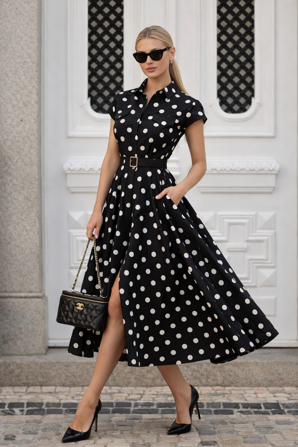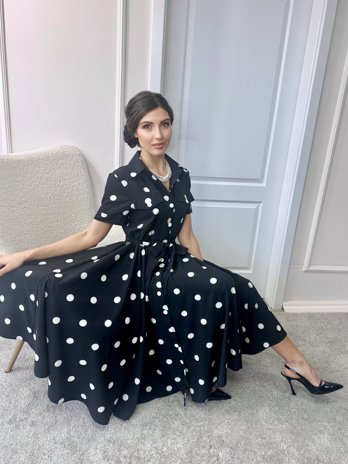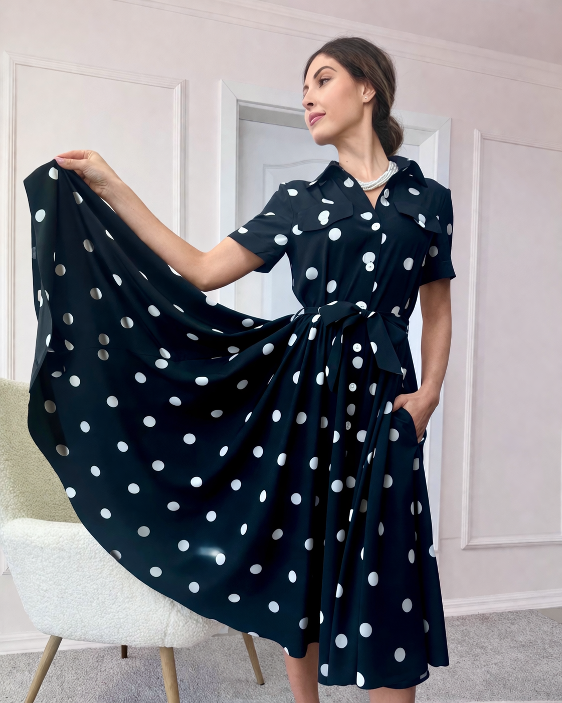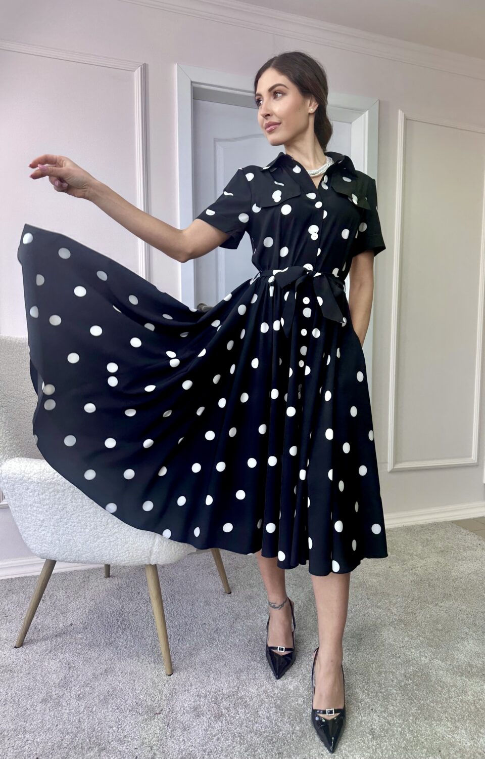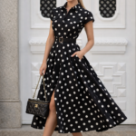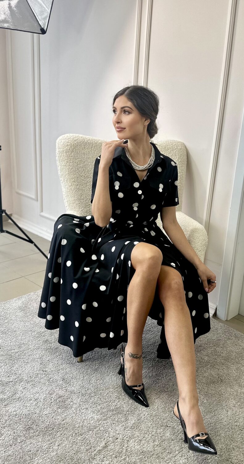 Дамска рокля NORA Polka, съчетава класическата елегантност на десена на точки с модерна и изчистена линия. Вдъхновена от винтидж стила, тя подчертава женствеността по фин и естествен начин.