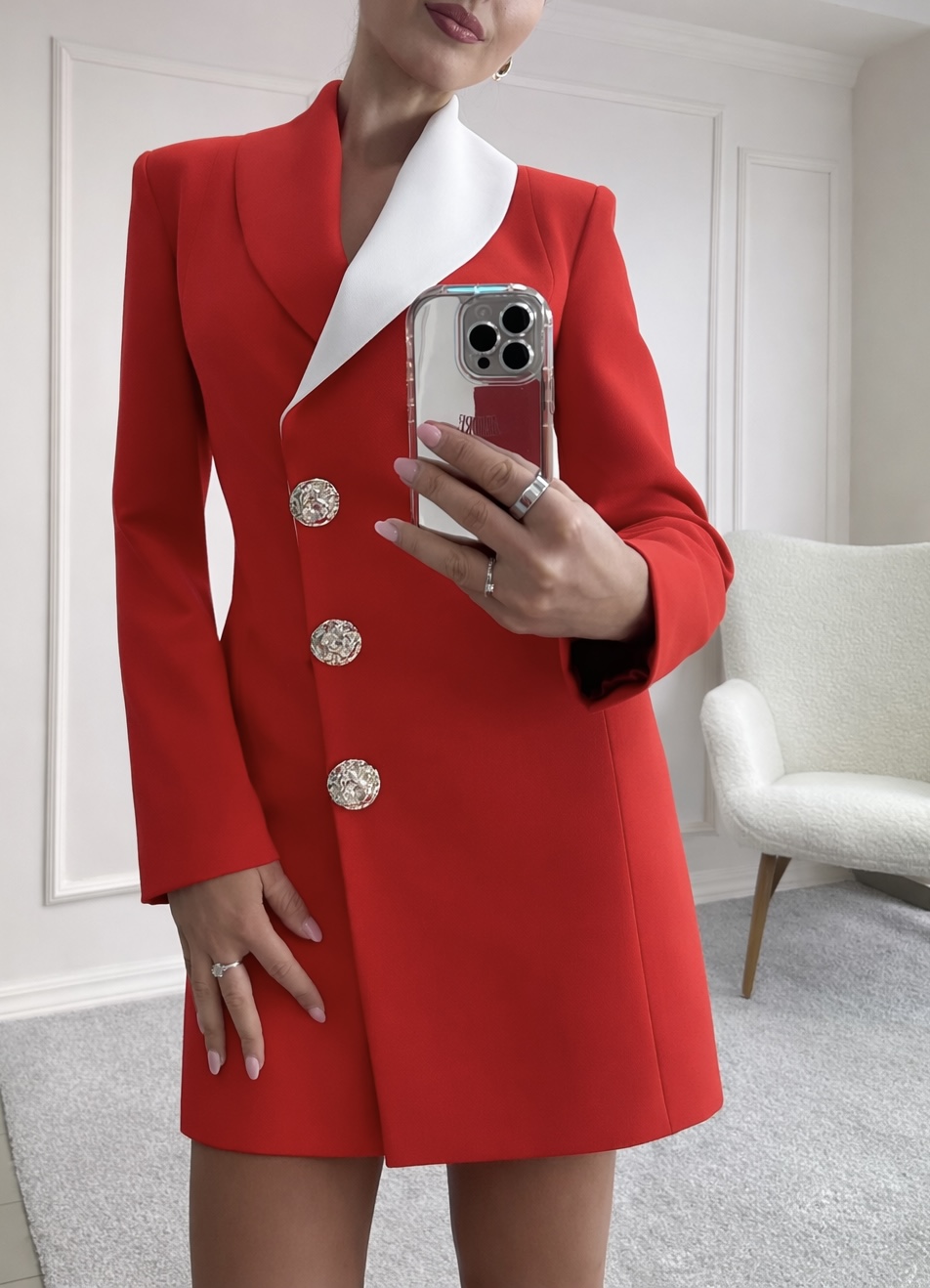 Елегантна, структурирана рокля с подчертана талия и изчистен силует. Моделът е с издължено V-образно деколте и контрастен бял ревер, който придава усещане за висша мода и графична линия. Закопчаването е асиметрично с три декоративни златни копчета, които добавят луксозен акцент.
