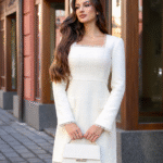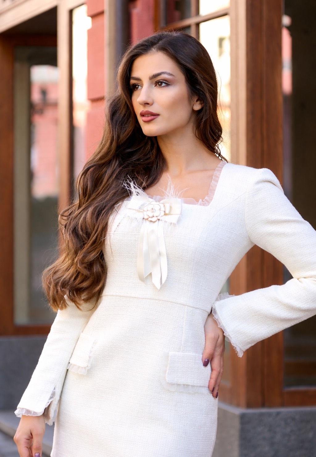 Дизайнерът е заложил на изчистена кройка, допълнена с нежни къдрички от органза на деколтето, ръкавите, подгъва и капачетата. А класата на луксозния плат туид се усеща още при първия допир.