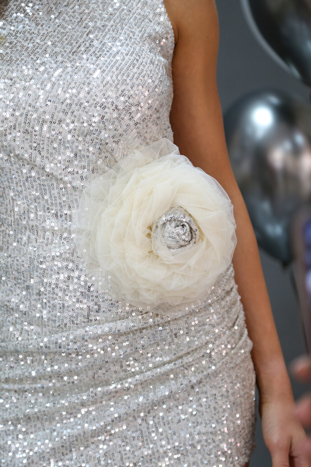 Изработена от изящен плат със сребристи пайети върху тюлена основа, тази рокля е създадена, за да превърне всяка парти визия в ослепителен шедьовър.