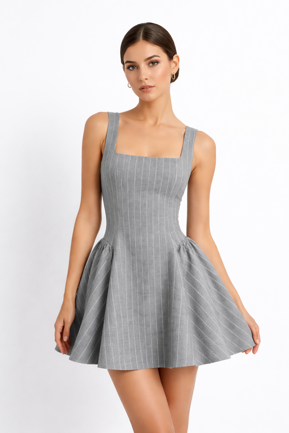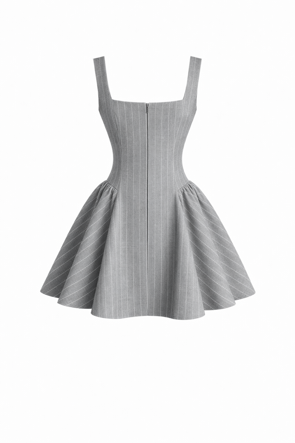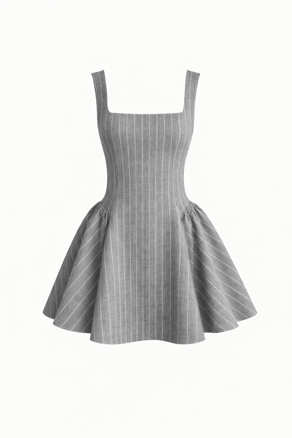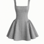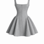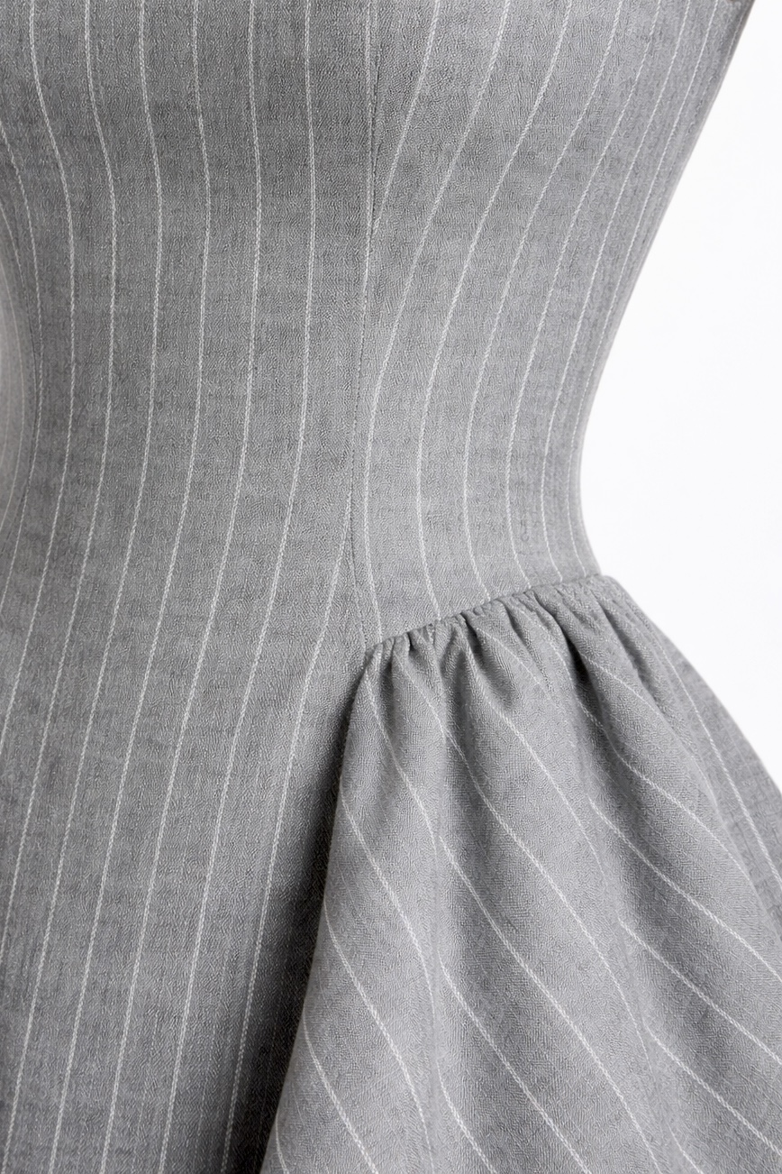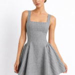 Елегантна рокля с подчертана талия и разкроена пола, изработена от висококачествена студена вълна с фино райе през два см. Корсетната линия оформя силуета, а квадратното деколте и широките презрамки придават модерен и изчистен характер. Роклята е с подплата, което гарантира комфорт и перфектно прилягане.