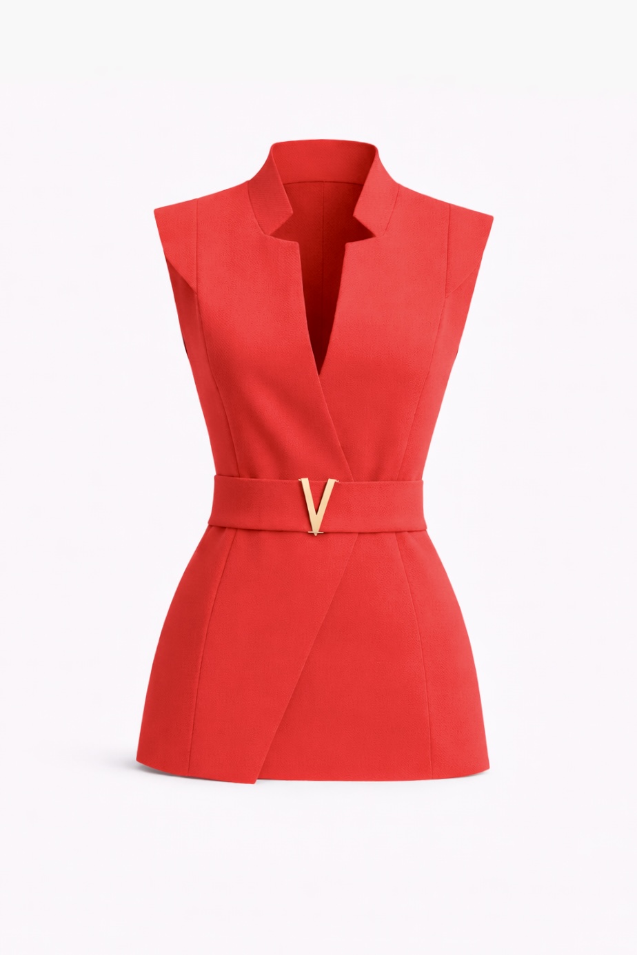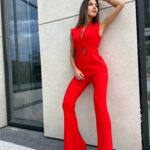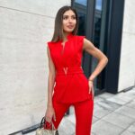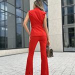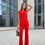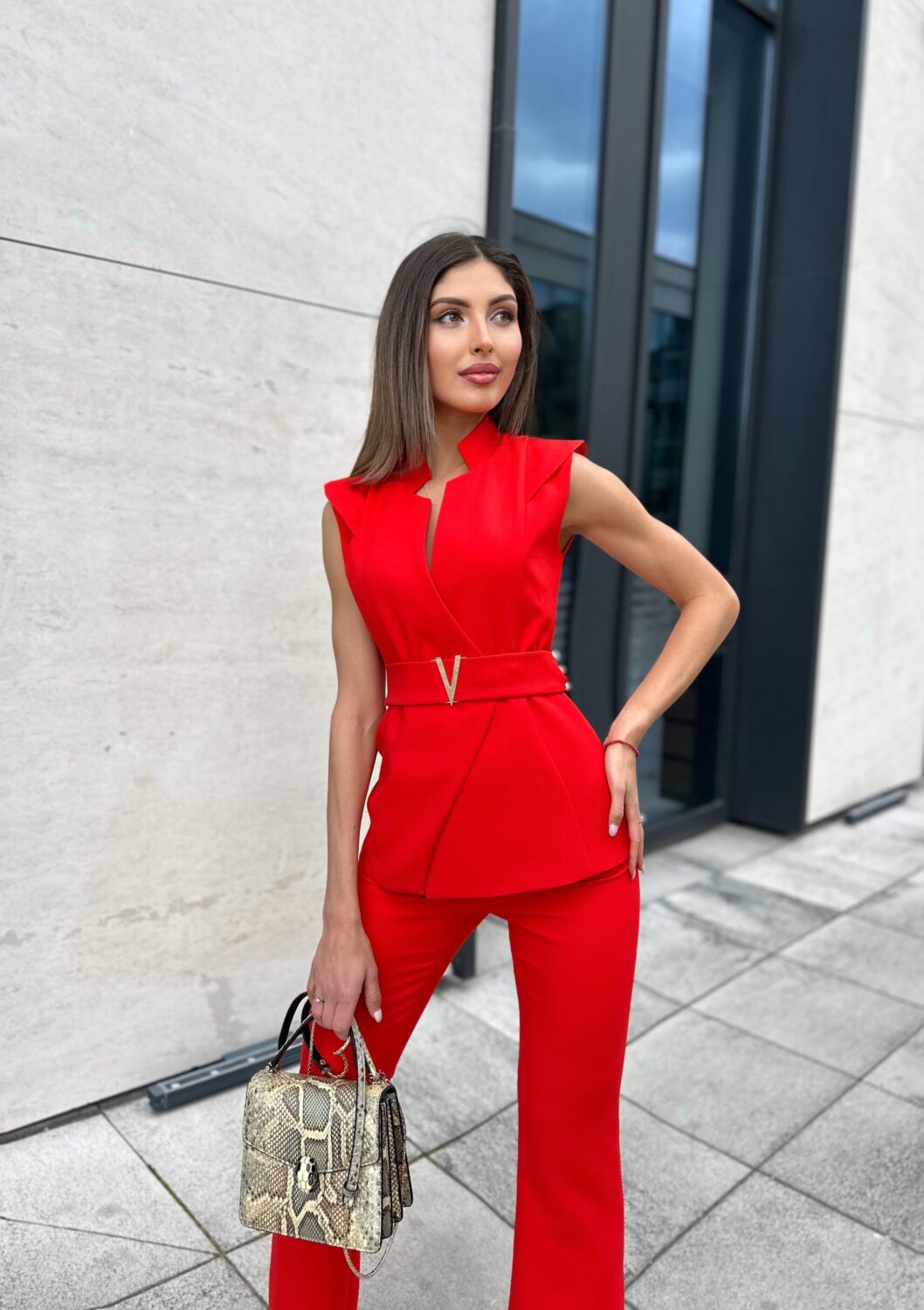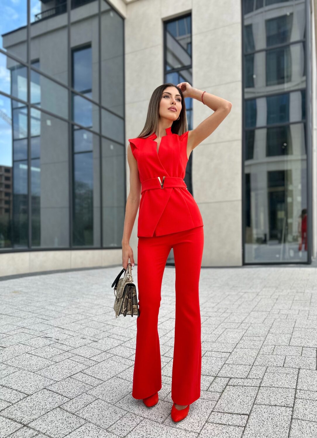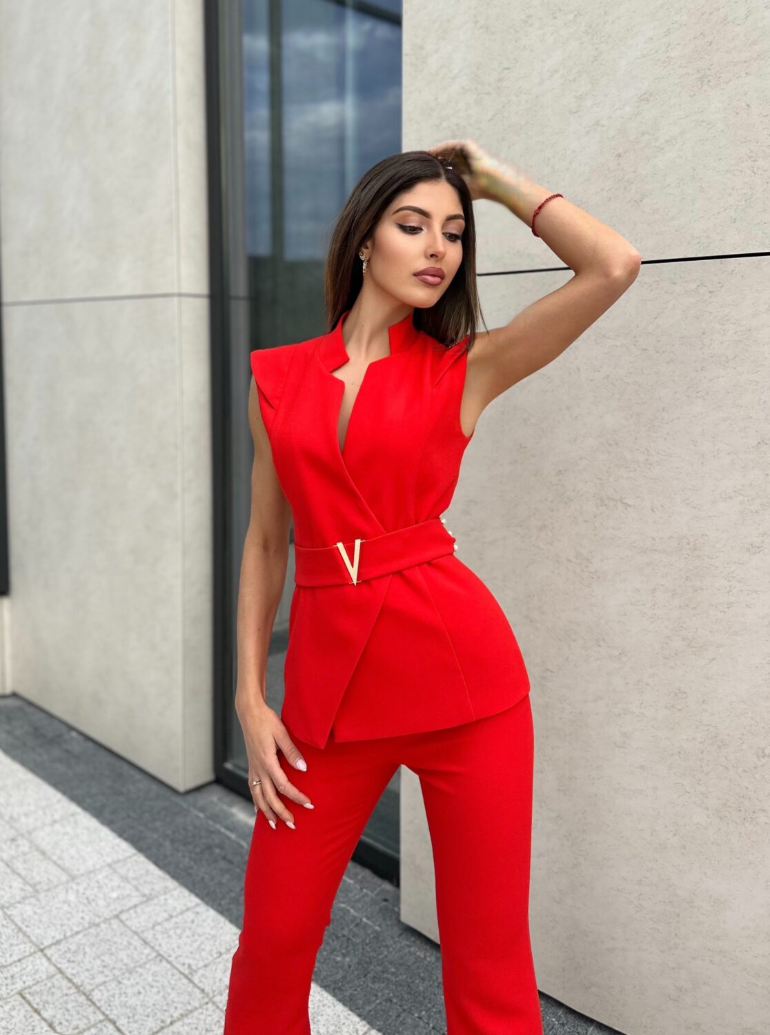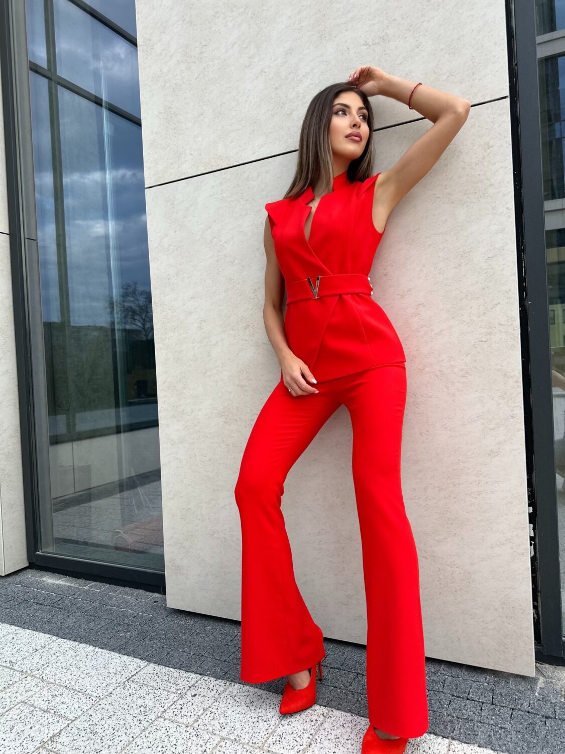 Дамски костюм изработен от пленително кораловочервен цвят.