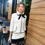 Костюм изработен от висок клас плат “туид”. Перфектно съчетание на бял основен плат с черно кадифе и памучна дантела.Костюмът се предлага и с дълъг ръкав по желание на клиента.