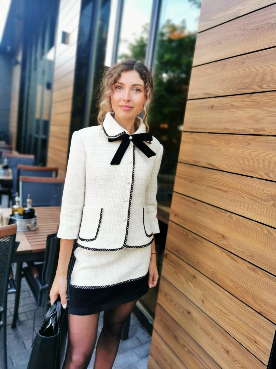 Костюм изработен от висок клас плат “туид”. Перфектно съчетание на бял основен плат с черно кадифе и памучна дантела.Костюмът се предлага и с дълъг ръкав по желание на клиента.