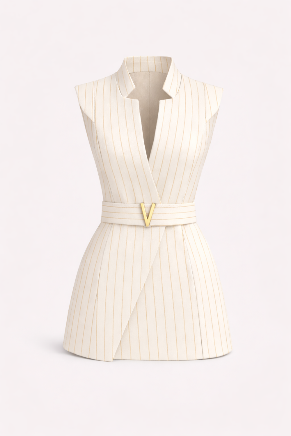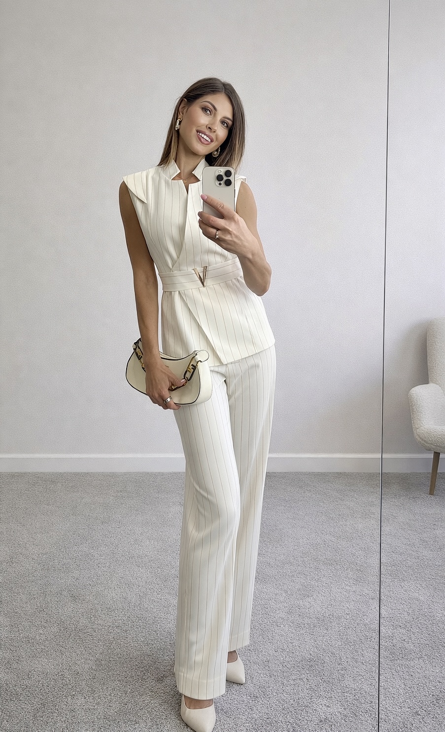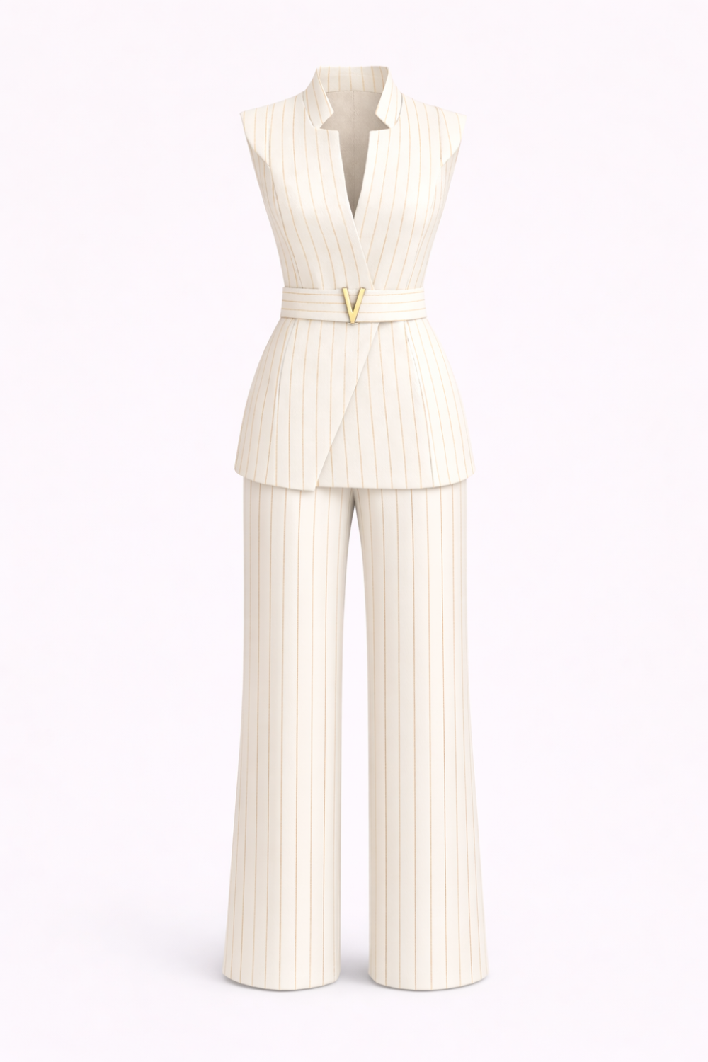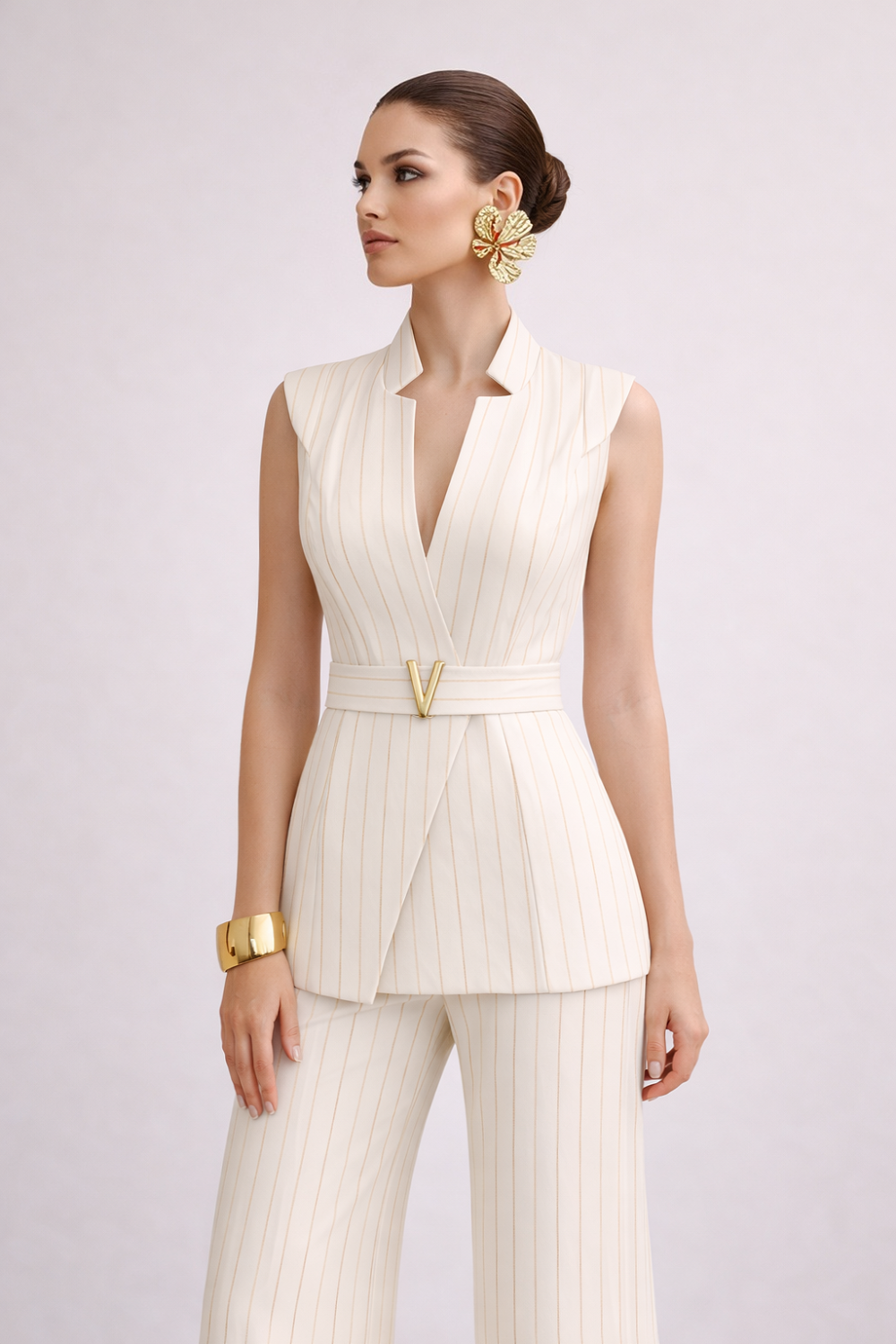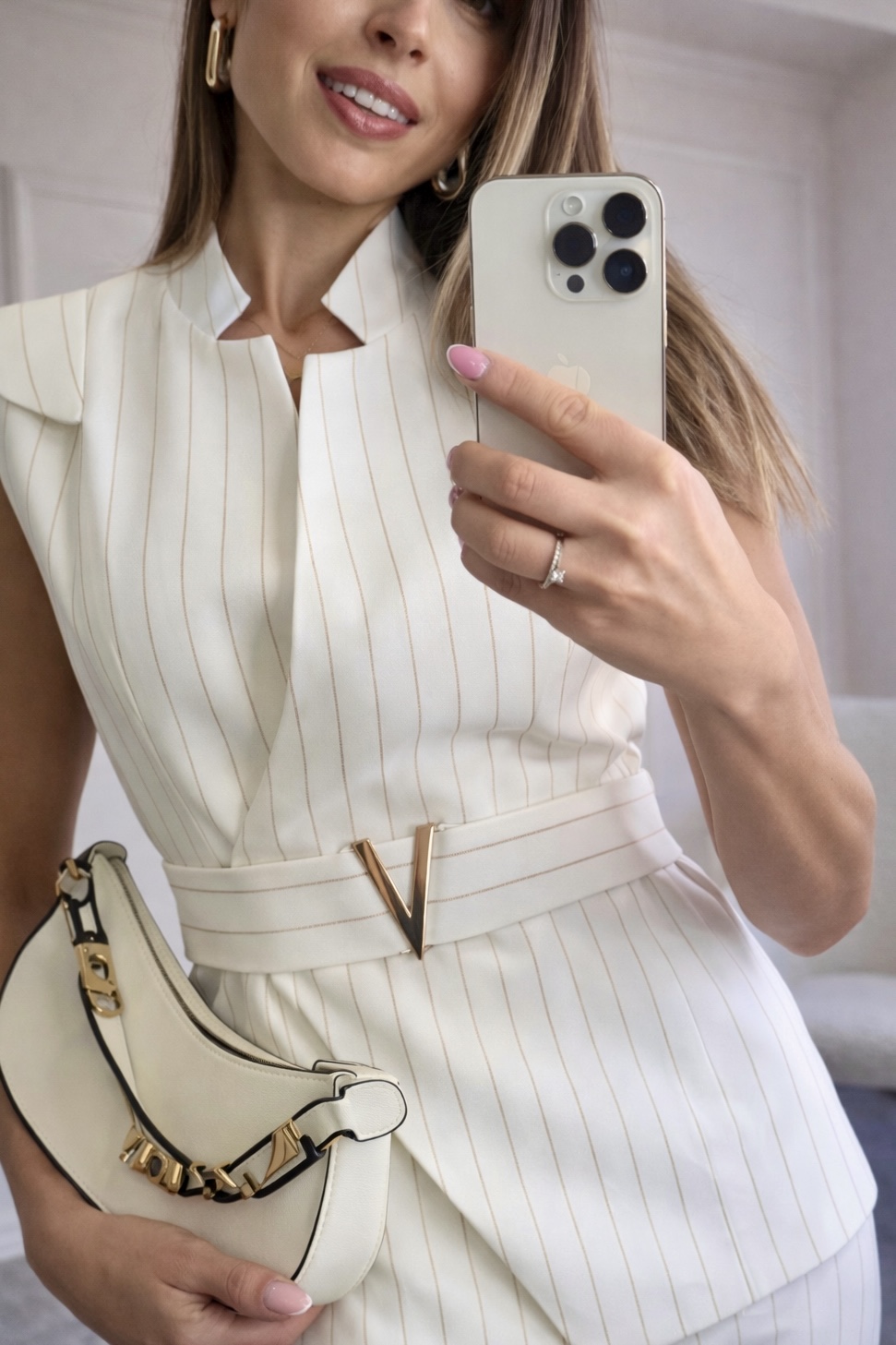 Дамски костюм Ramona, изработен от изключително качествен плат в екрю с деликатна златиста нишка в райе.