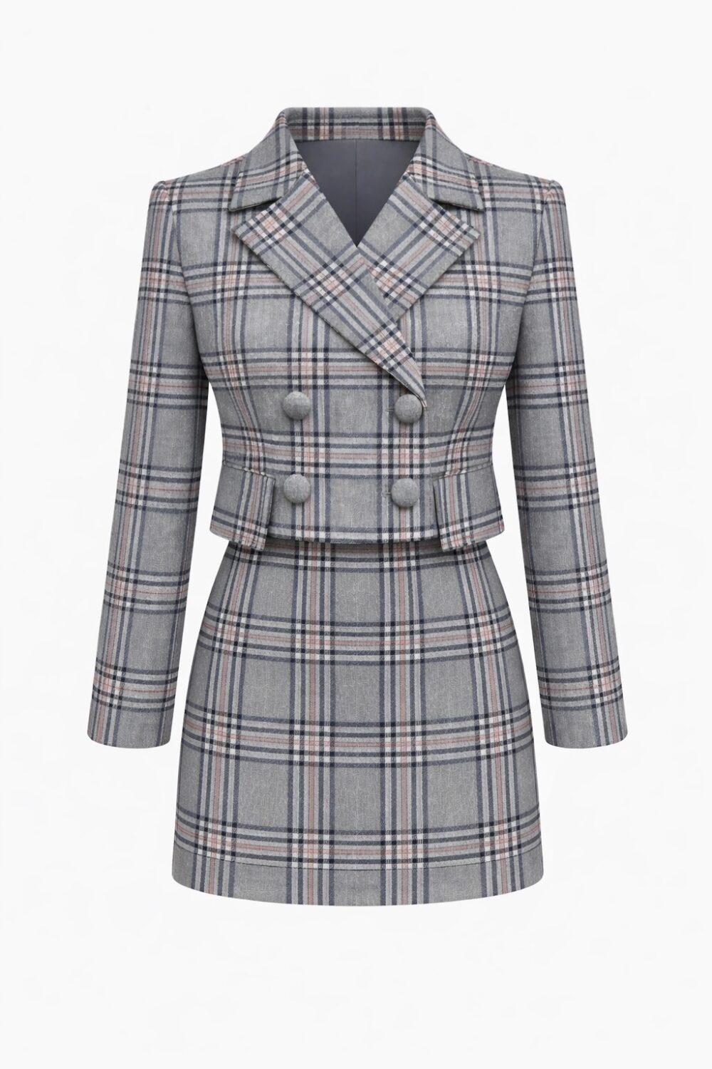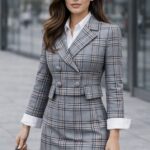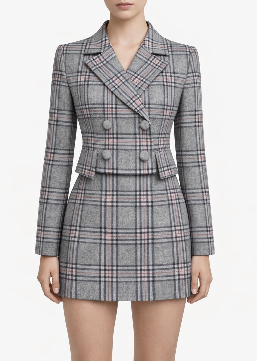Елегантен дамски костюм от две части, създаден за модерната градска жена. “SOFIA” комбинира класическо каре с съвременна кройка, която подчертава талията и визуално издължава силуета. Сакото е вталено, с двуредно закопчаване и изчистена линия, а полата допълва визията със стил и баланс. Костюмът е изработен от висококачествена смес от естествени материи и е с подплата за максимален комфорт и перфектно прилягане.