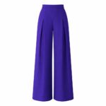 Моделът е с висока талия, която оформя силуета, и широк крачол, който пада свободно и създава усещане за лекота и движение. Фините плохи добавят структура и завършеност, а наситеният лилав нюанс придава дълбочина и характер.