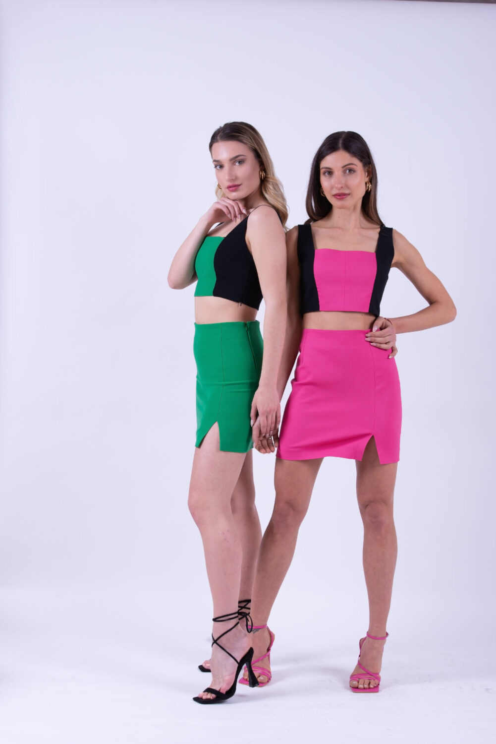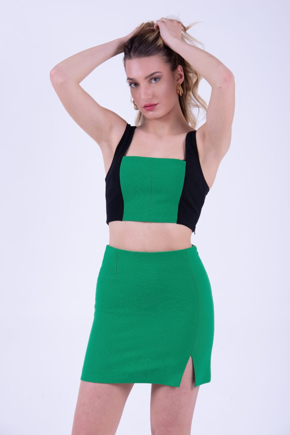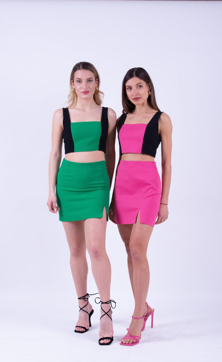Предлага се в черно с циклама и черно с зелено. Комбинация от ефектно бюстие и малка пола с цепка на бедро. Закопчаване със скрити ципове в странични шевове.