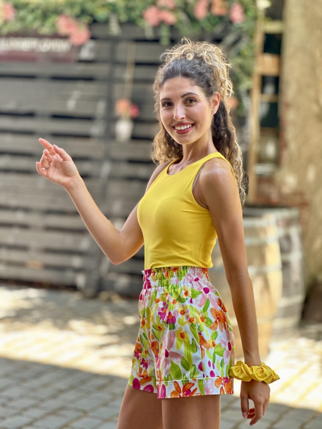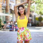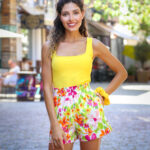 – Къси панталонки с ефектни флорални мотиви изработени от еластичен памук, с два джоба в страничен шев и широк ластик.