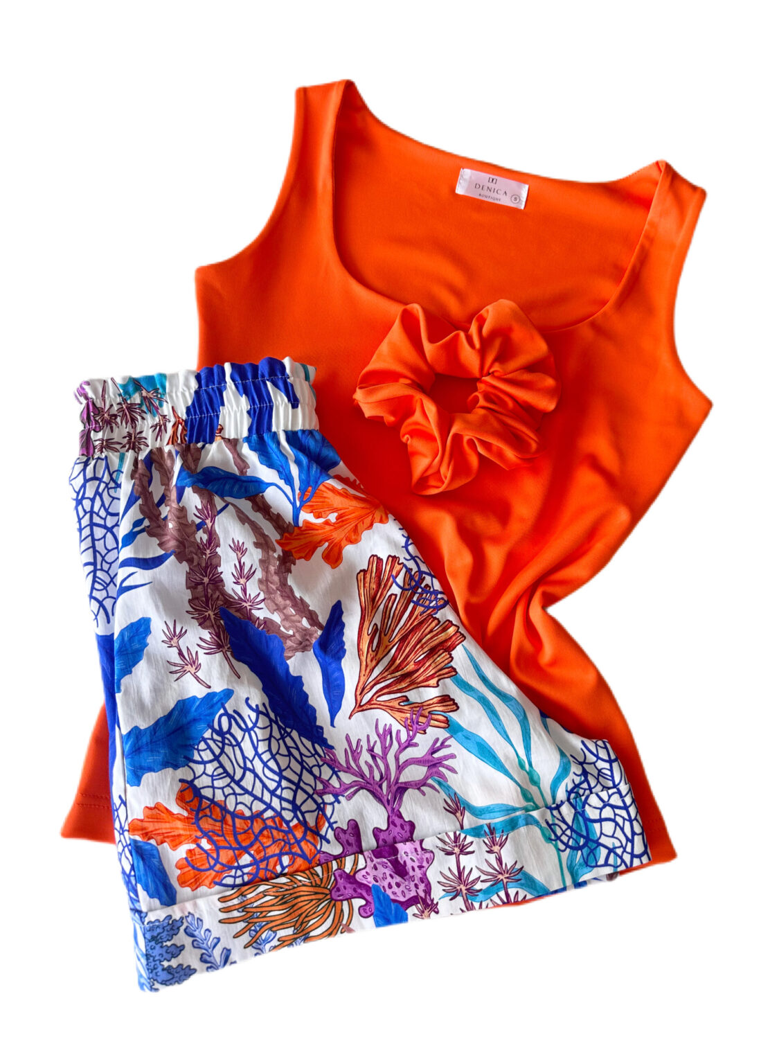 – Къси панталонки с ефектни морски мотиви изработени от еластичен памук, с два джоба в страничен шев и широк ластик.