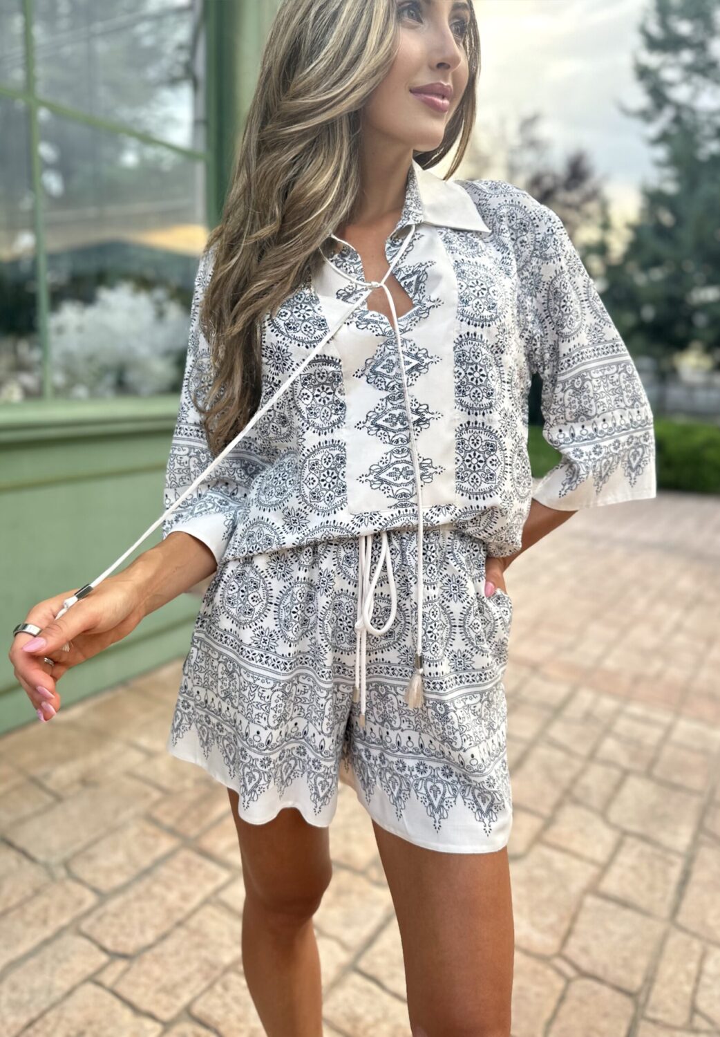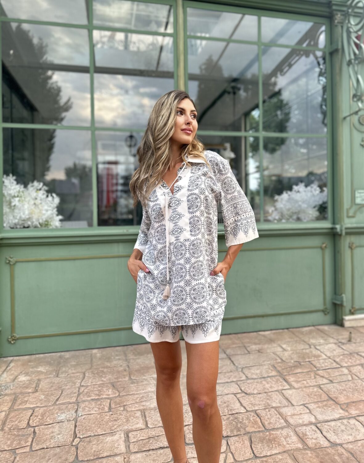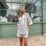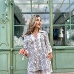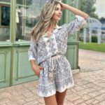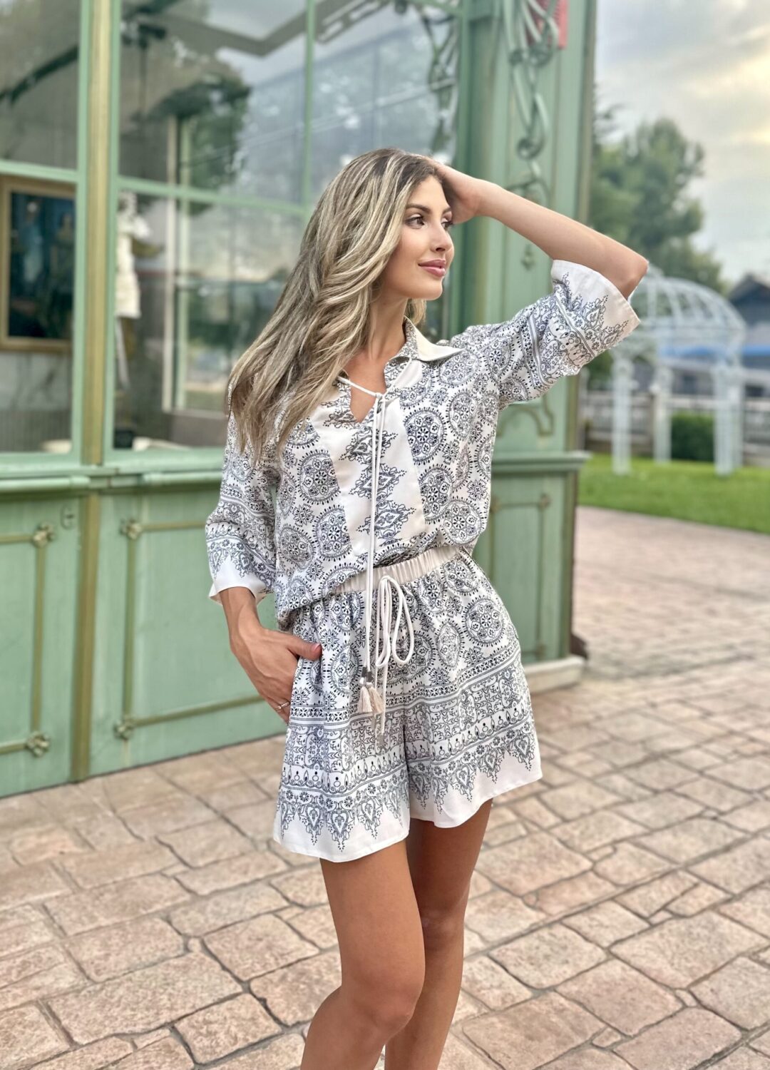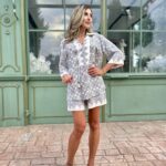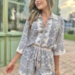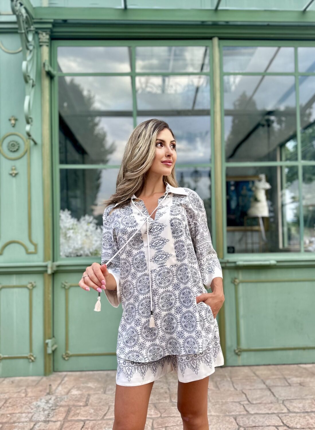 Излъчване на свобода и артистичен дух, в лежерна и лятна интерпретация. Ризата е с подчертана предна платка и връзка с пискюли на деколтето, придаваща деликатен бохемски акцент. Принтовете са интелигентно разположени като бордюр по ръкавите и долната част на дрехата – фино и запомнящо се дизайнерско решение.