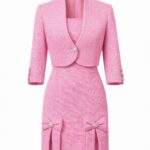 Малка и изящна розова рокля със вталена кройка, нежни панделки със сребристи копчета с камъни завършват двете цепки на бедрата. А презрамките изработени от сребристи елементи допълват изцяло роклята-бижу.