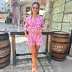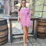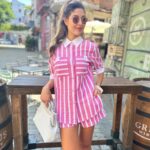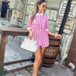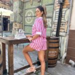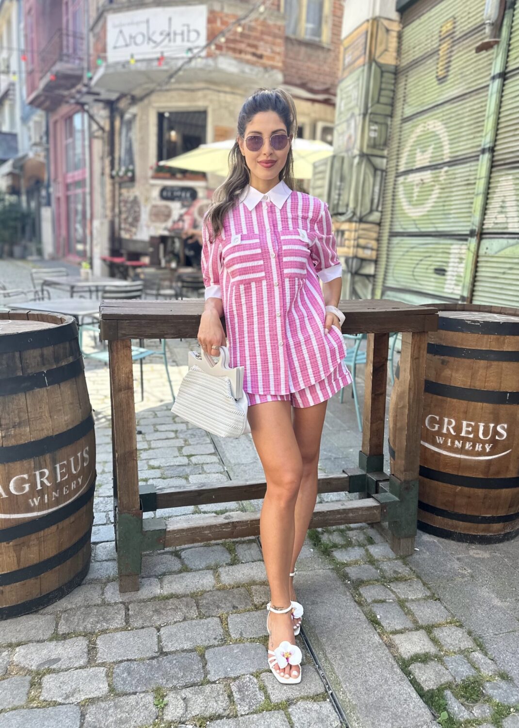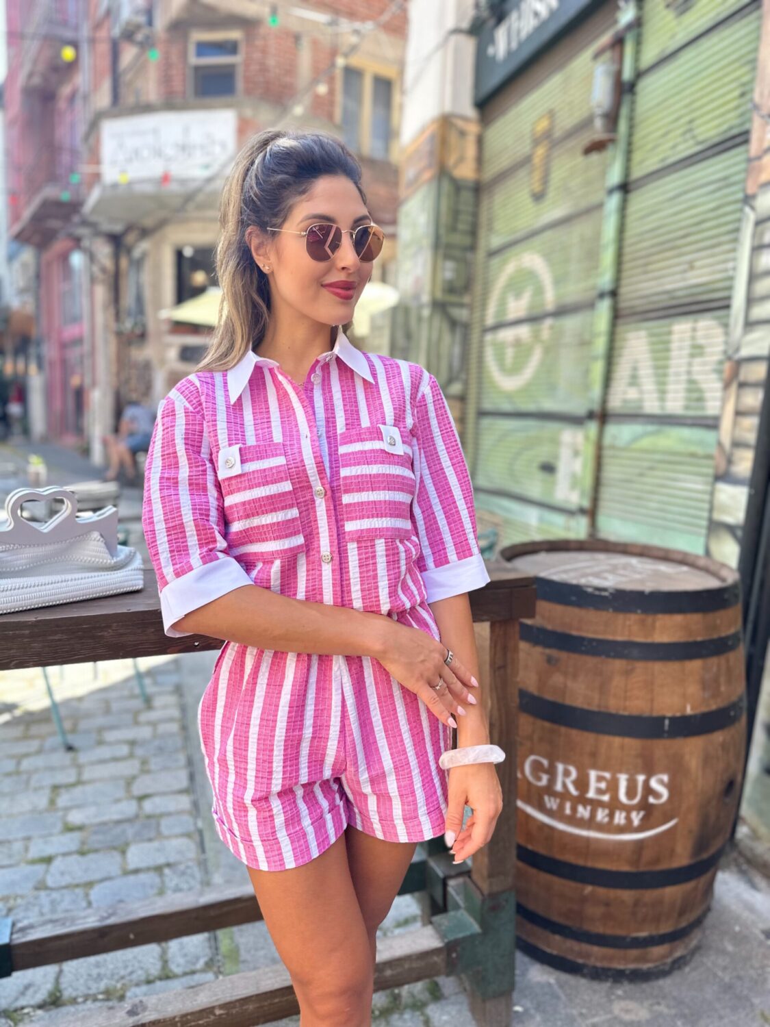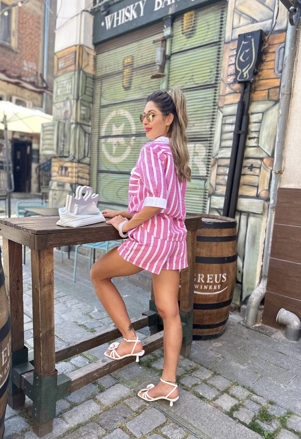 Освежете гардероба си с този стилен и удобен летен комплект, състоящ се от риза и къси панталони. Изработен от лека и памучна материя Моделът впечатлява с модерния си десен в розови, бели и дискретно сребристи райета контрастиращи с бели маншети и яка. Ризата е с права кройка и декоративни джобове отпред и цепки в странични шевове, а късите панталони са с ластичен колан и странични джобове за допълнително удобство.