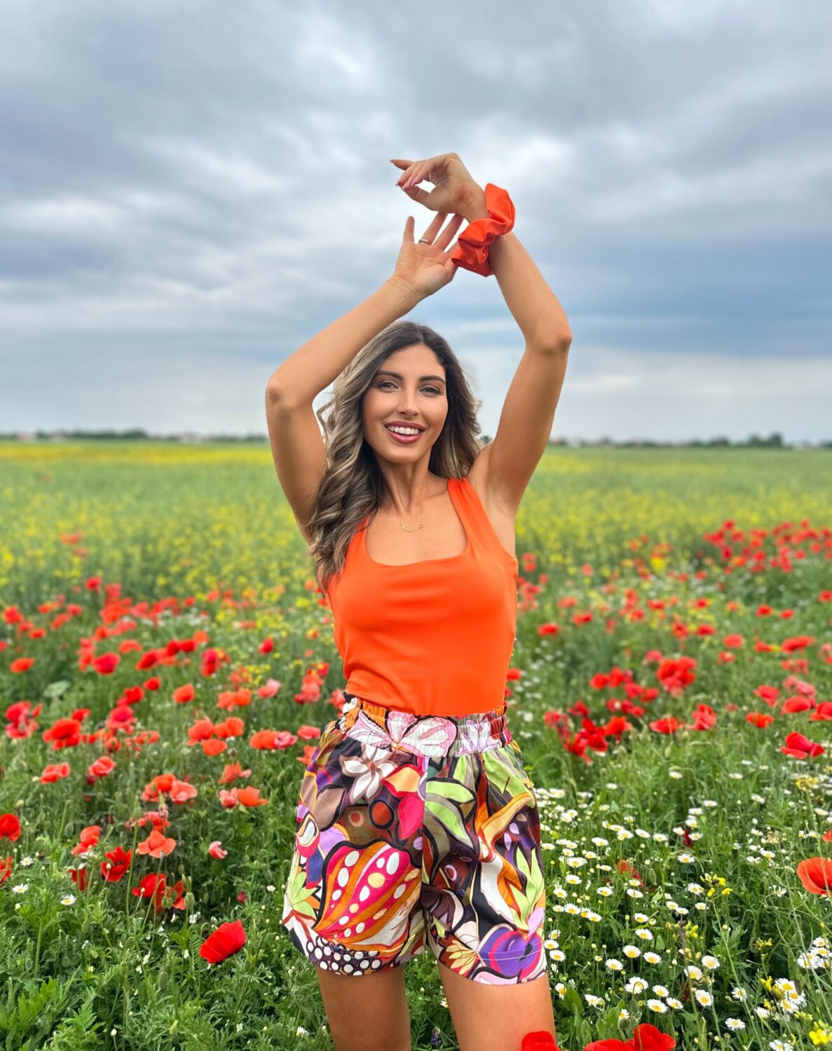 – Къси панталонки с флорални мотиви изработени от еластичен памук, с два джоба в страничен шев и широк ластик.