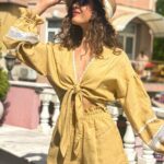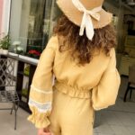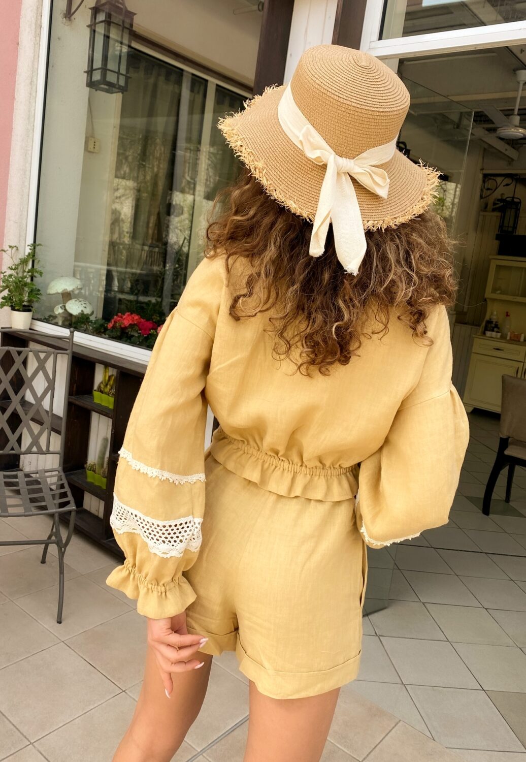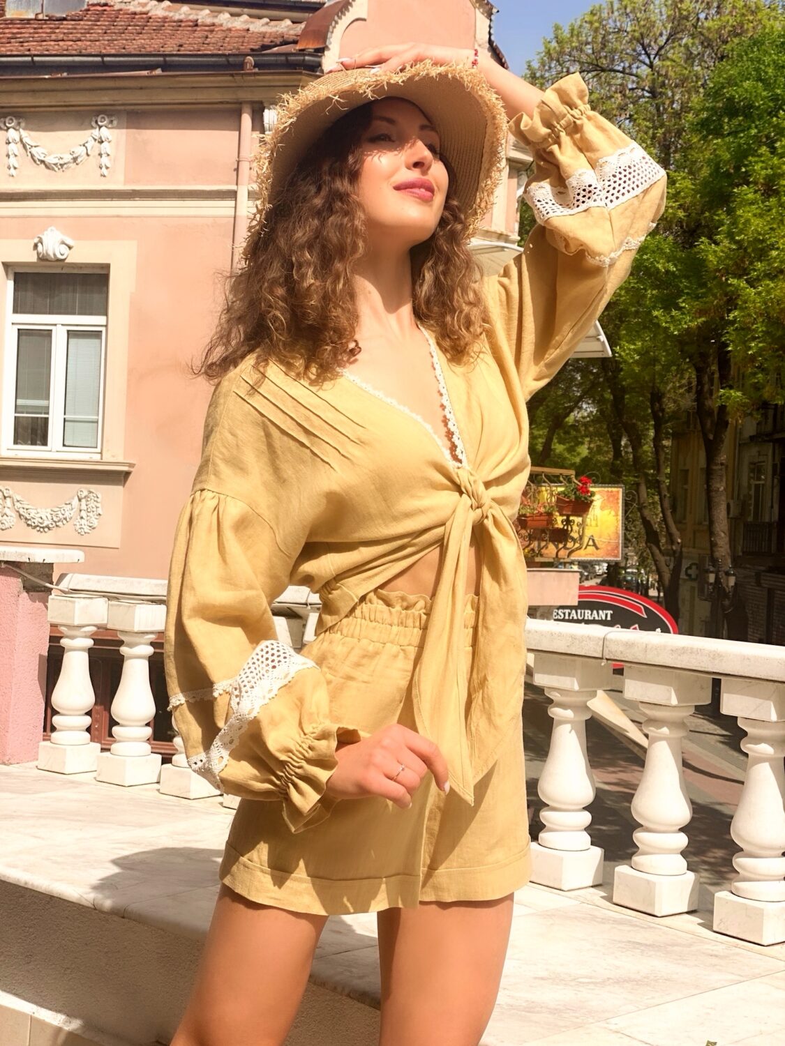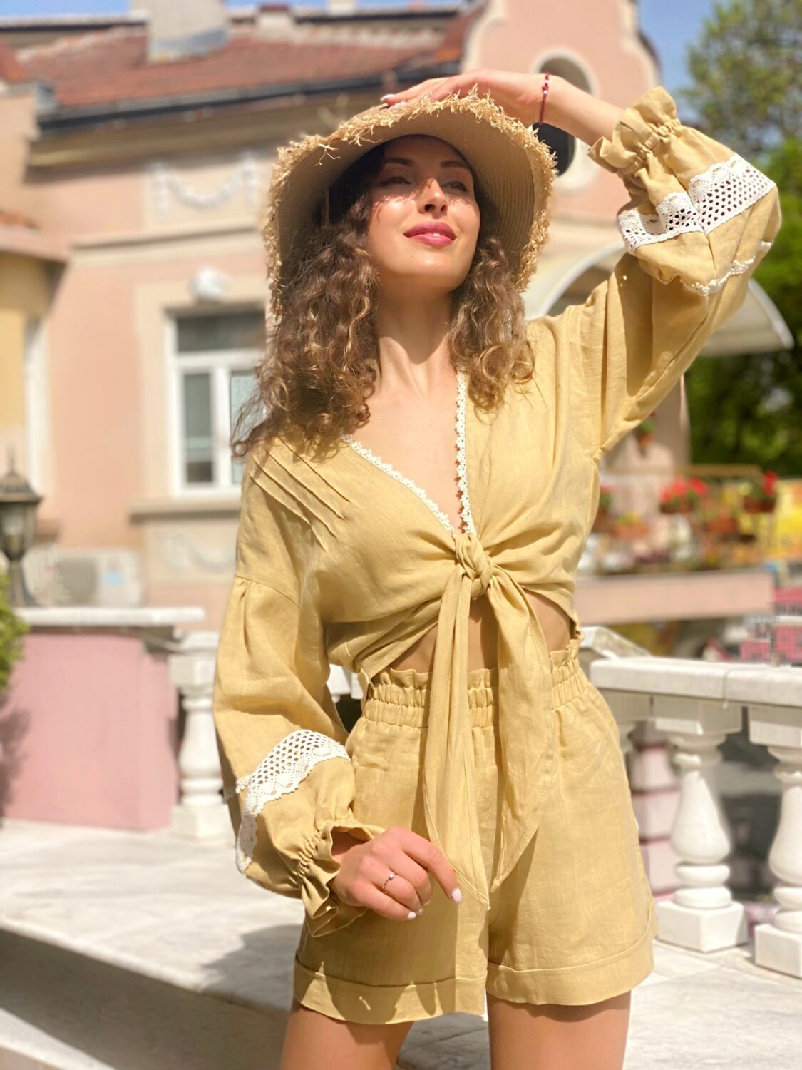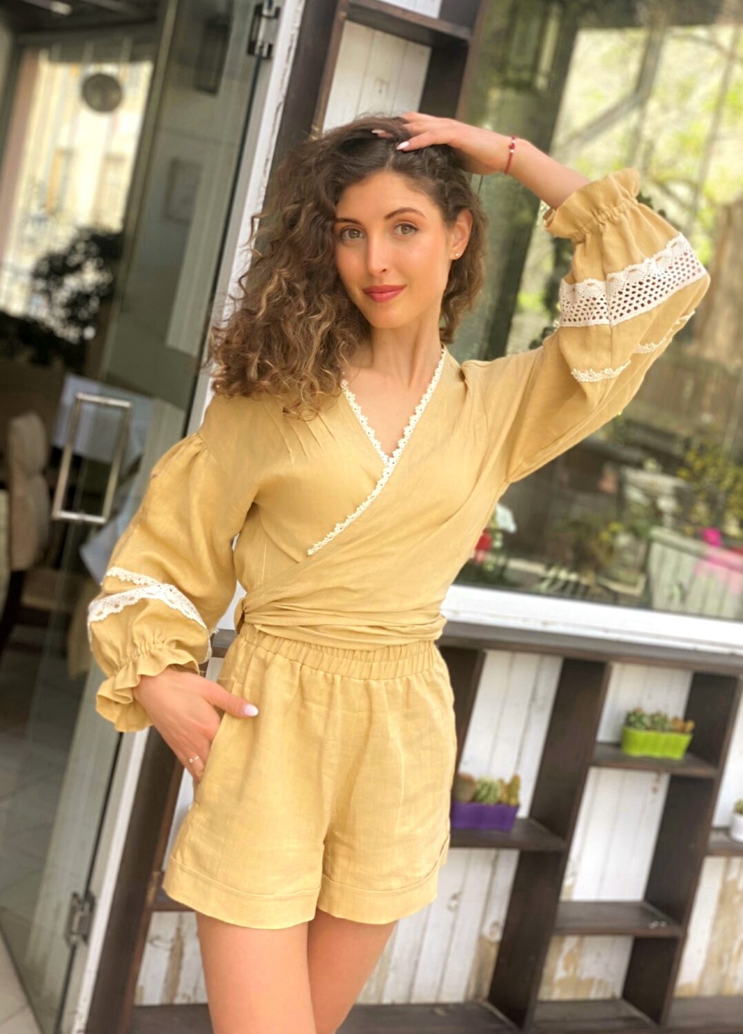 Туника от прекрасна ленена материя, съчетана с памучна дантела. Интересна кройка, която може да носите както “прегърниме“ блуза, така и като завързан топ в предна част. Интересен завършeк на гръб. Съчетайте с нашите ленени панталонки “Вдъхновение”