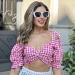 Къс дамски топ от 100% памук с класически каре десен в бяло и розово. Моделът е с къси буфан ръкави, връзки на раменете и елегантно усукване отпред, което подчертава талията. Идеален избор за летните дни, съчетава комфорт с закачлива женственост.