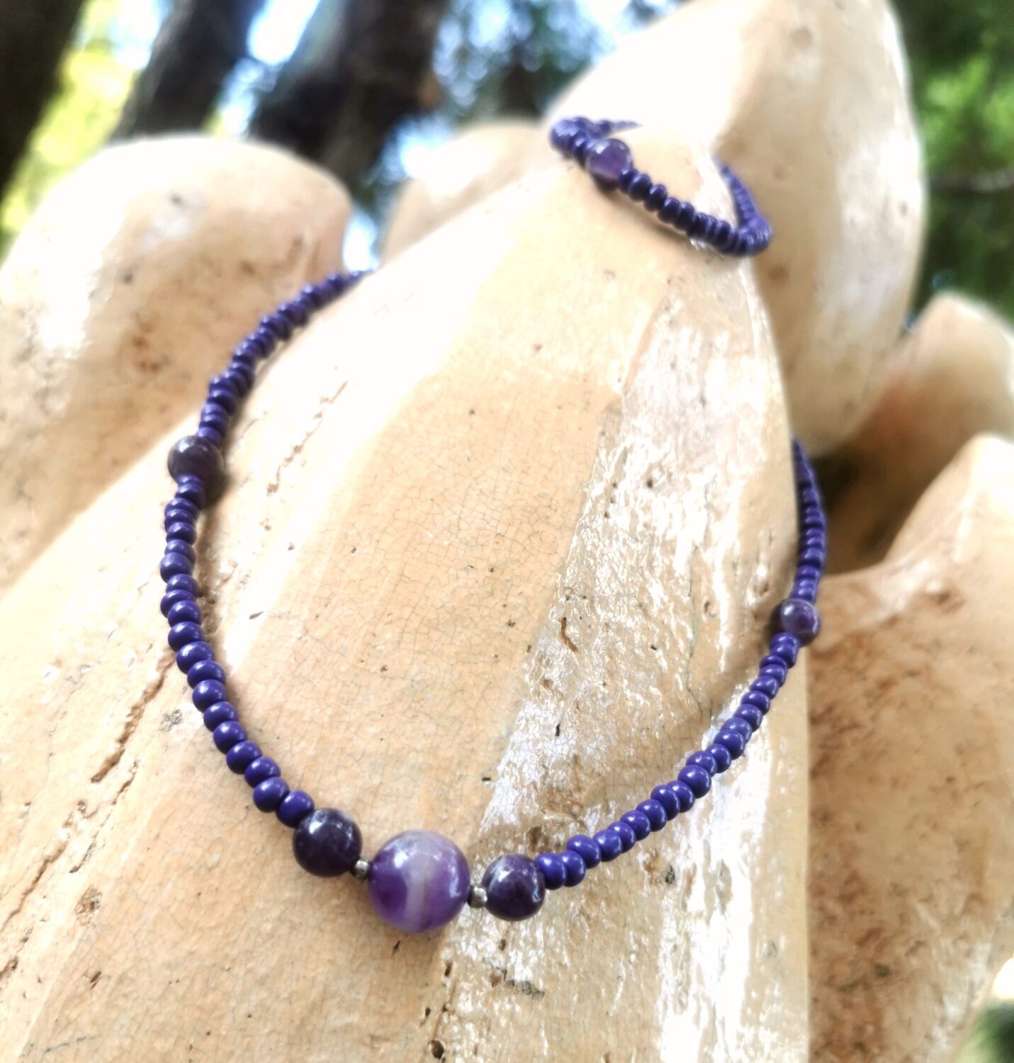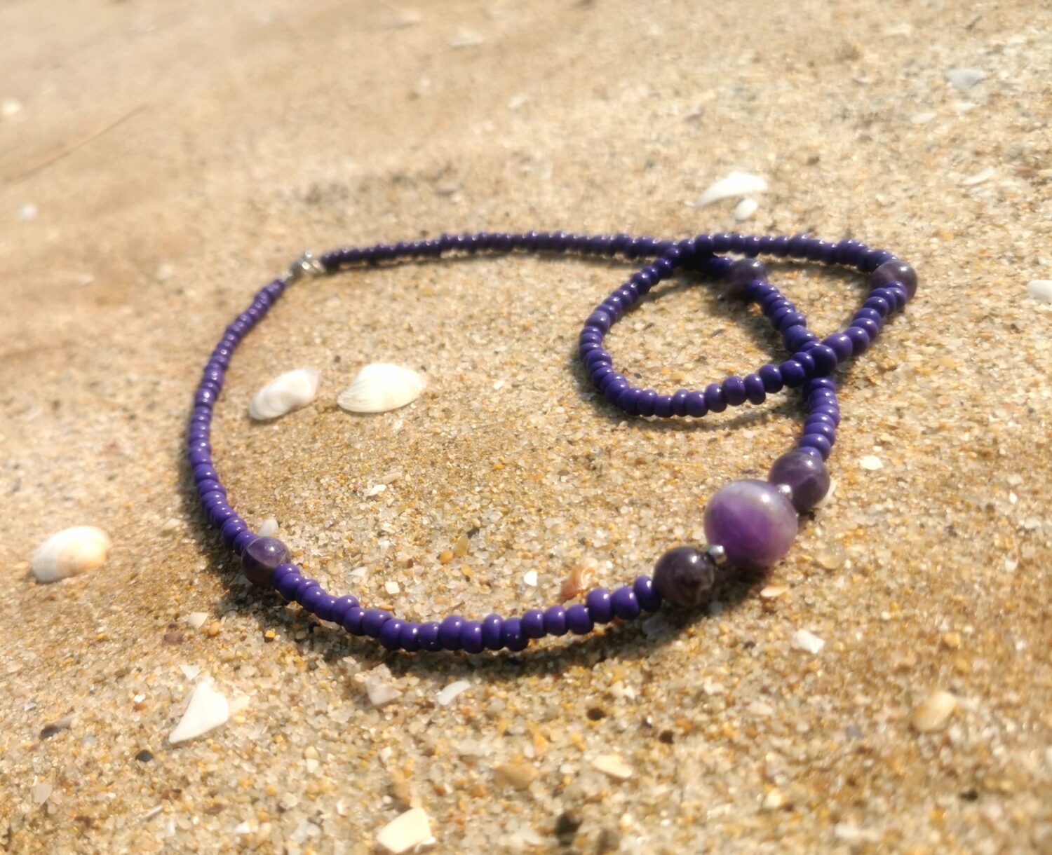 Използвани материали : Аметист, мъниста, стоманена закопчалка.