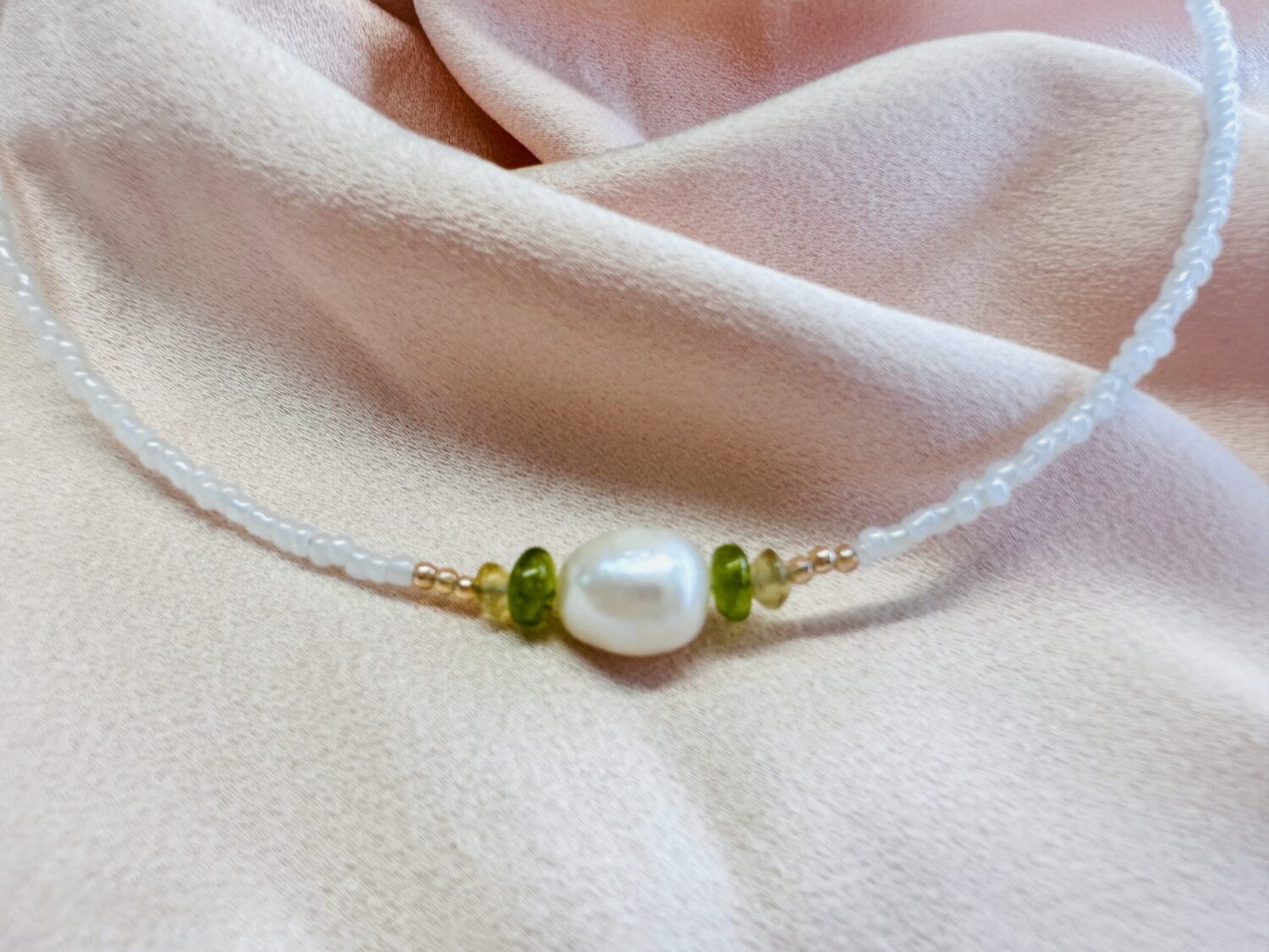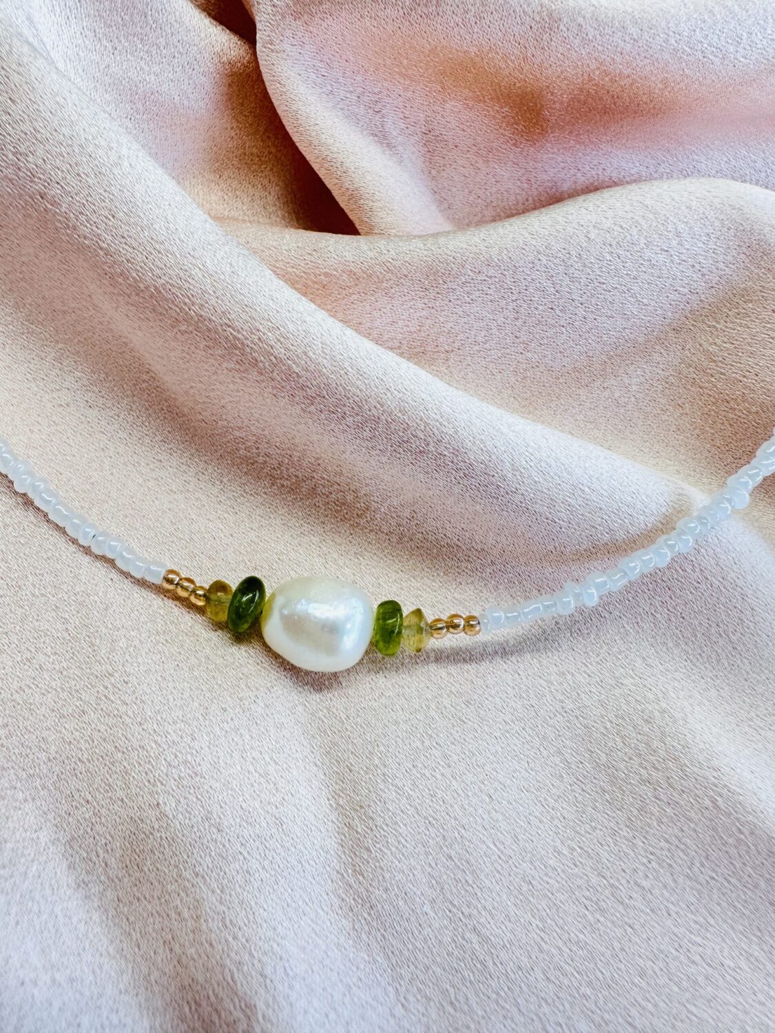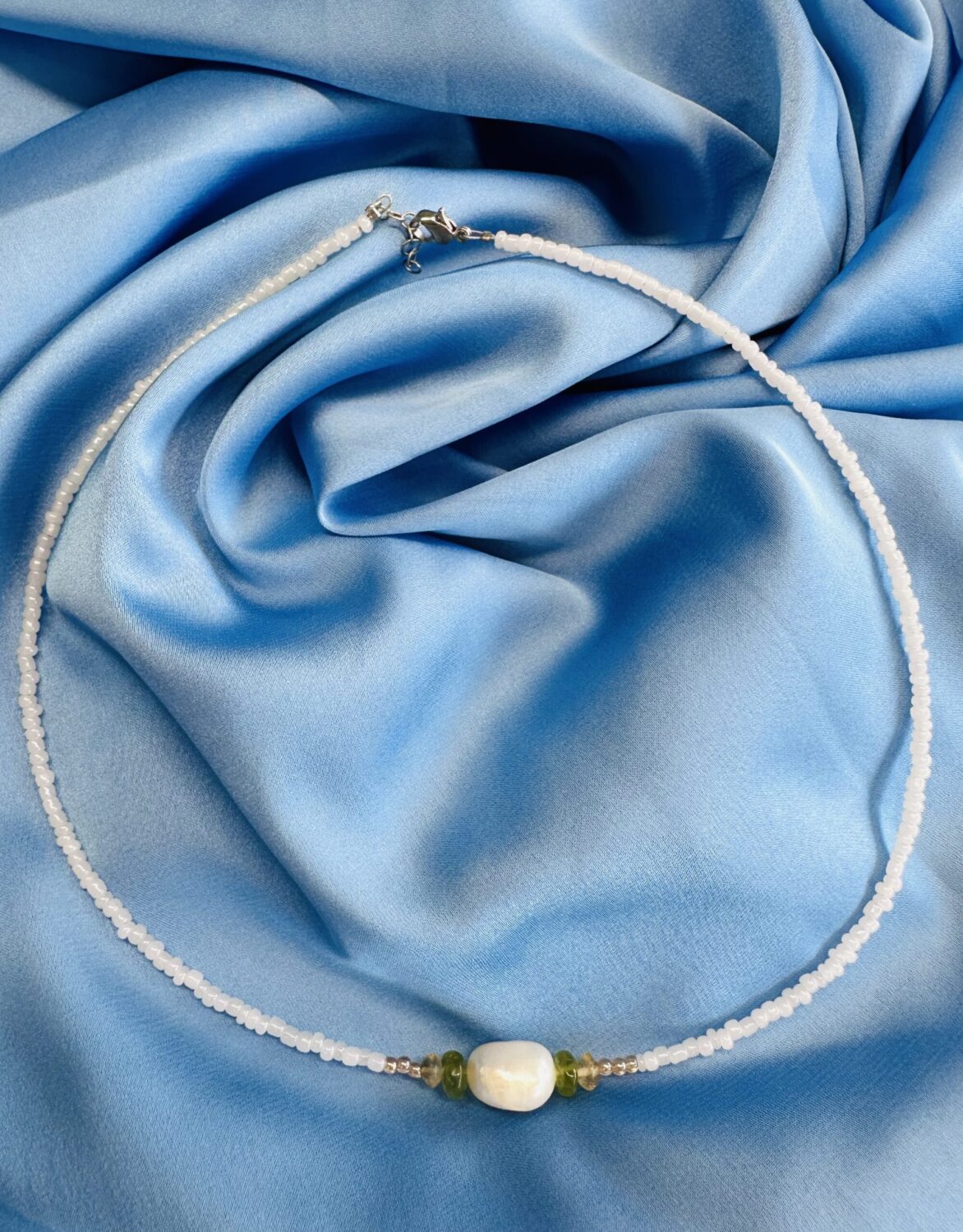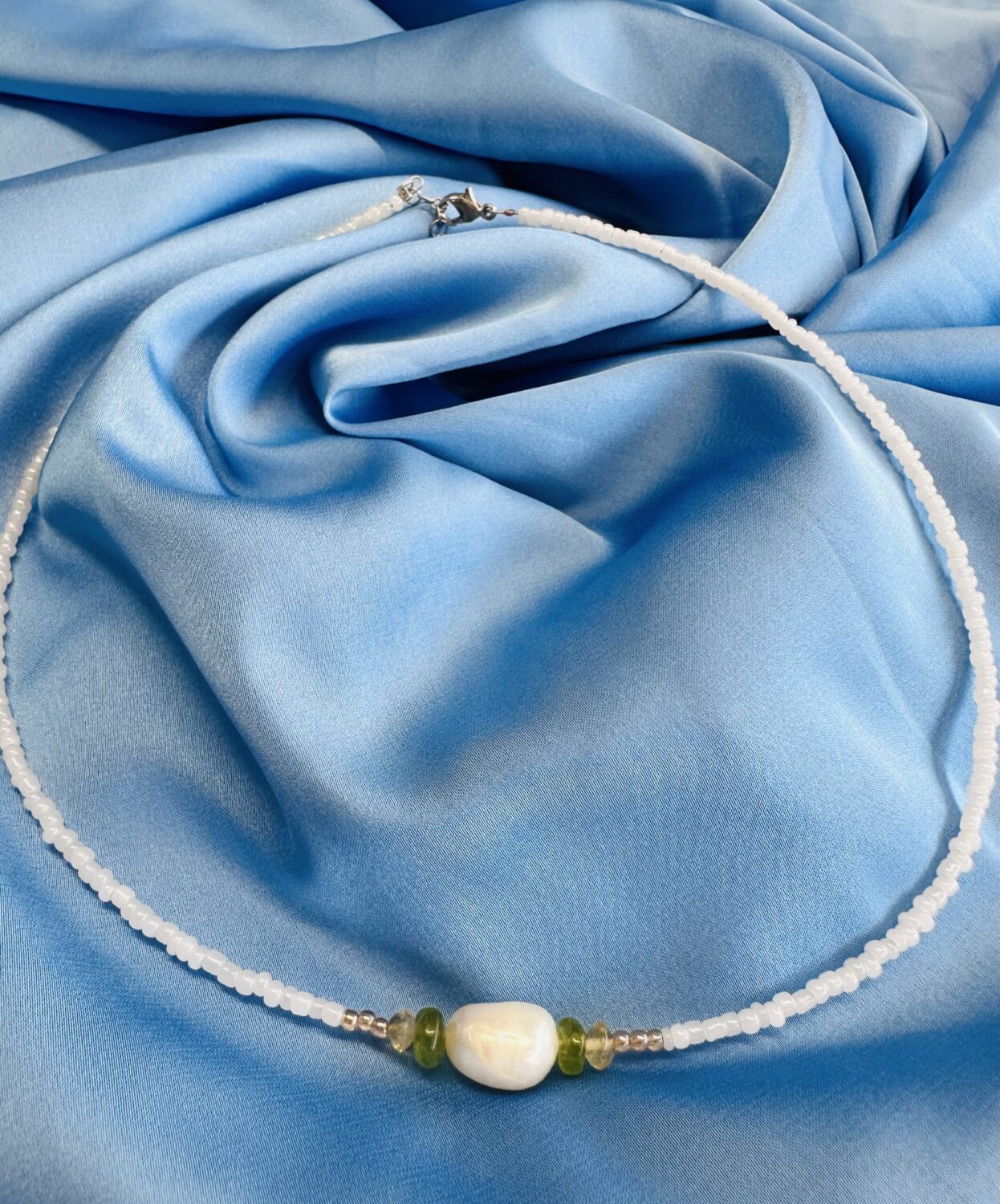 Използвани материали различни видове полускъпоценни камъни, мъниста, естествена перла, стоманена закопчалка, сребърен удължител