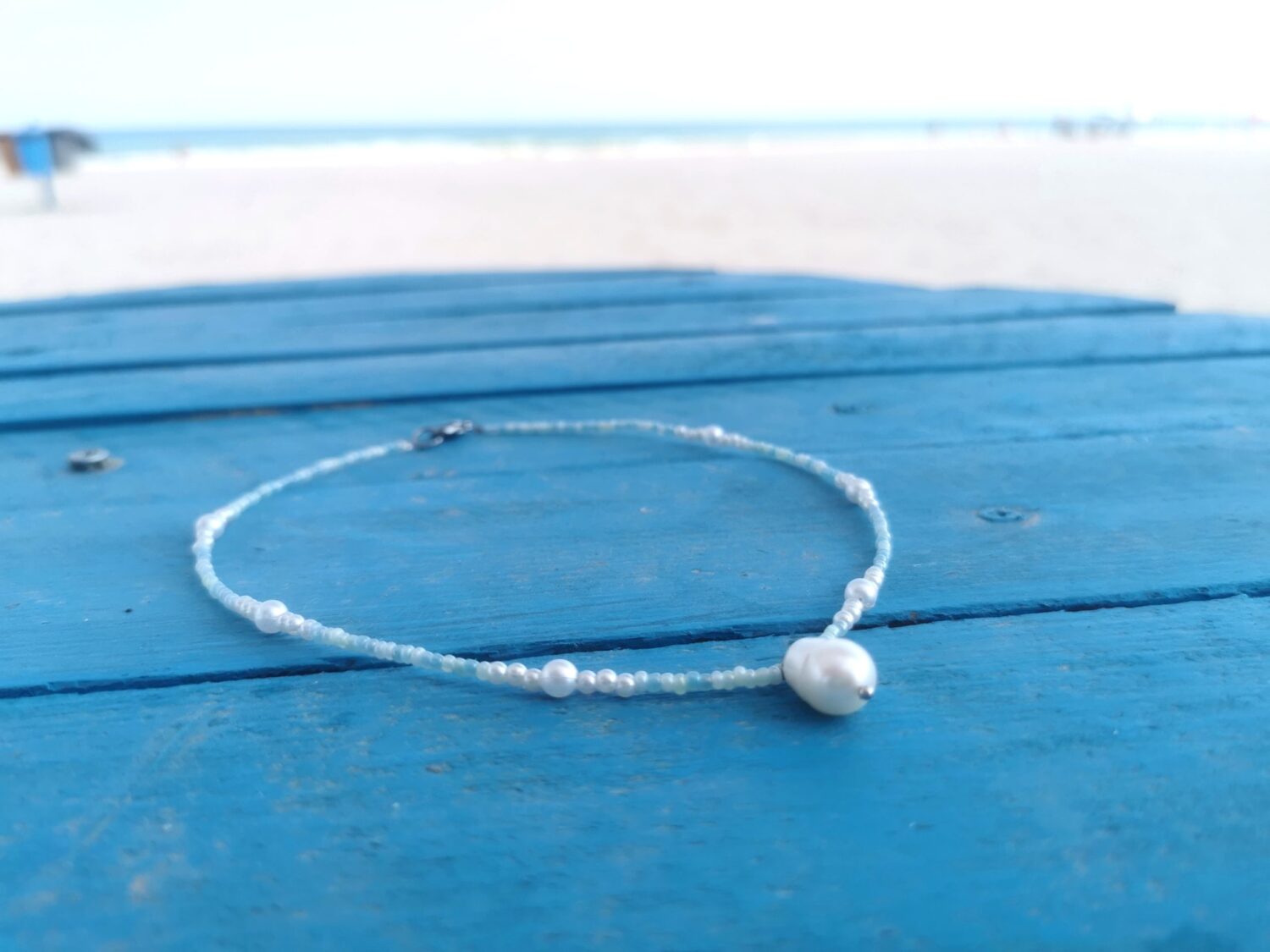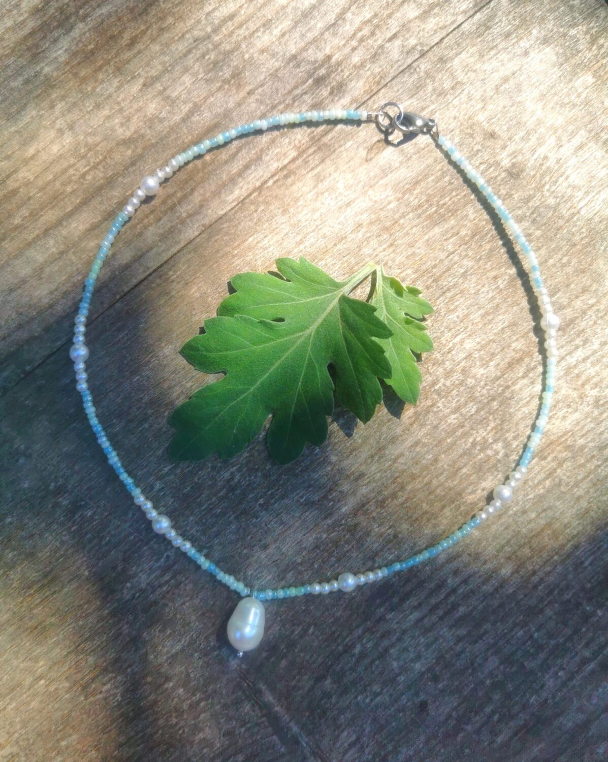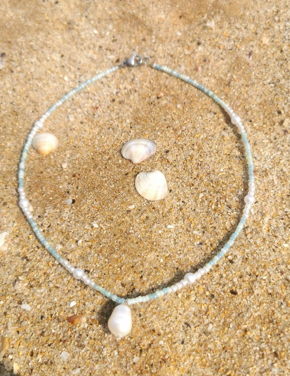Колие със светло сини и бели мъниста. А за завършак една красива речна перла