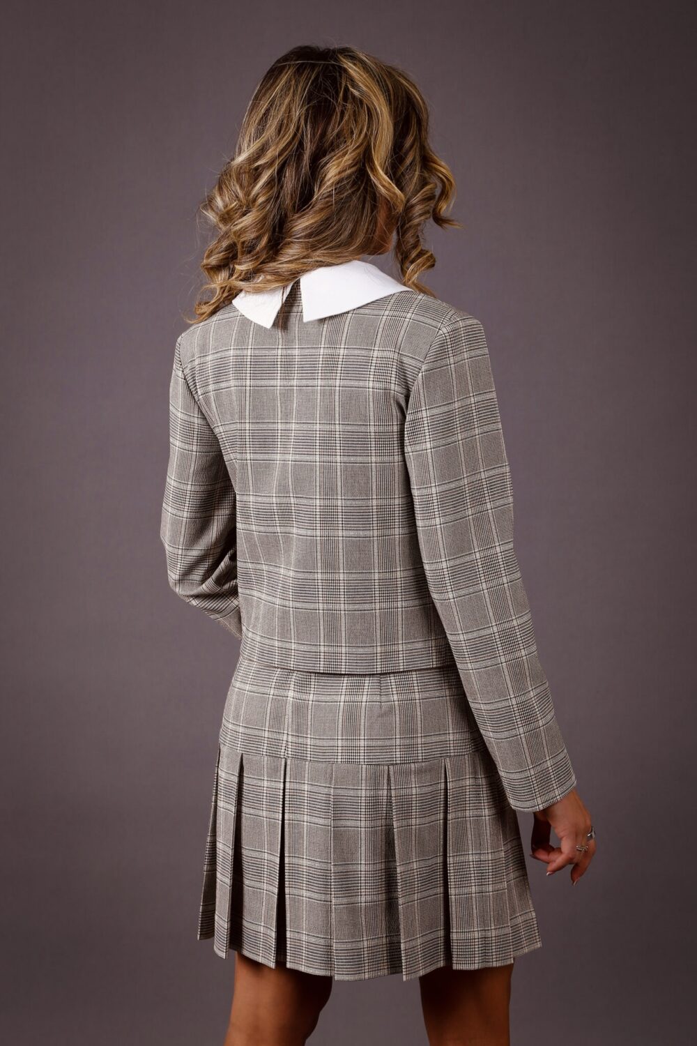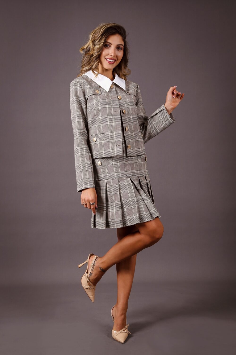 Луксозно сако в каре, създадено за дами с изтънчен стил. Прецизната кройка и подплатата осигуряват комфорт, а декоративните платки и златистите копчета придават аристократичен завършек. Реалните джобове с копче съчетават функционалност и елегантност.
