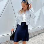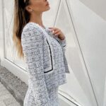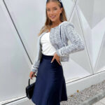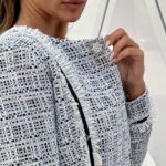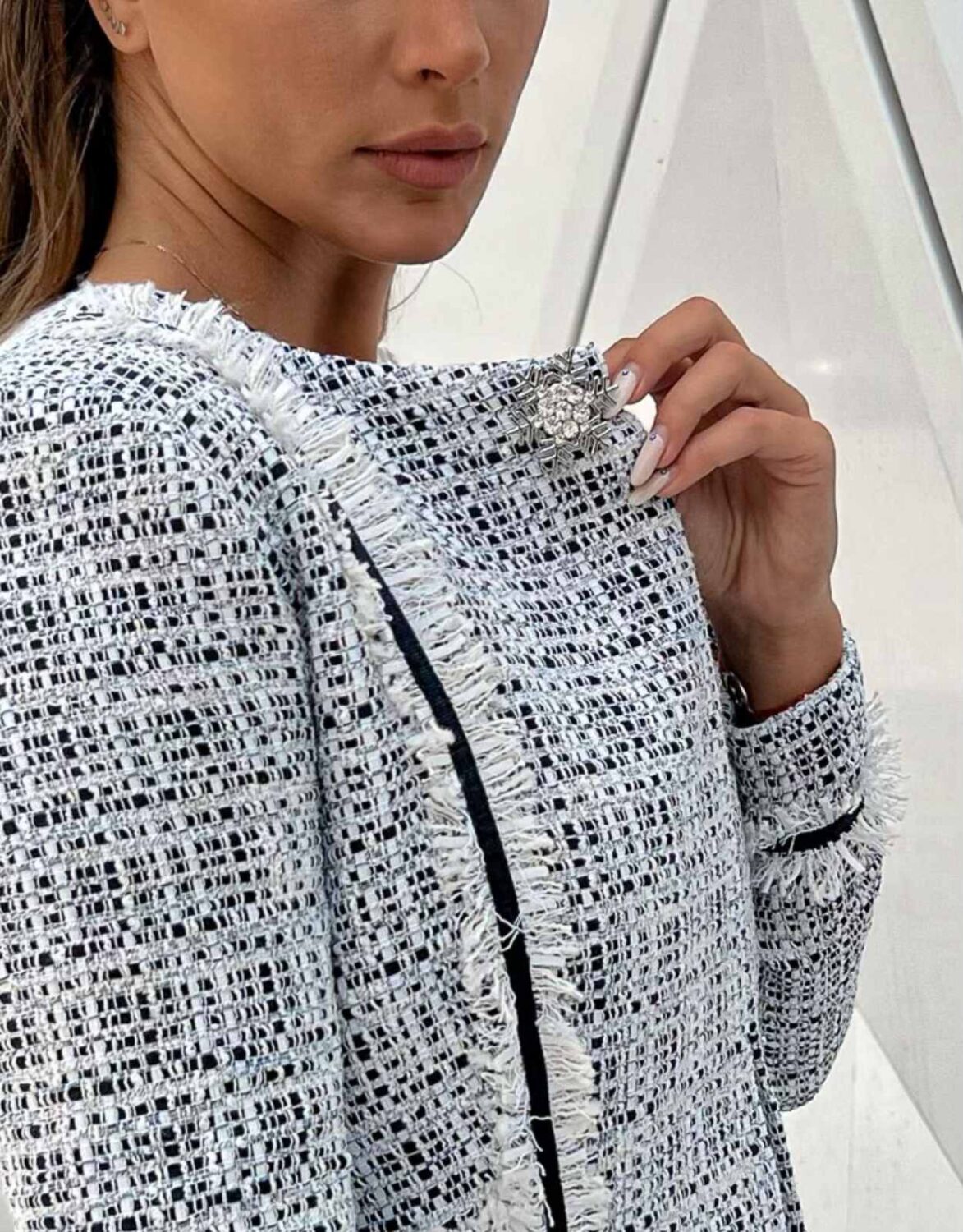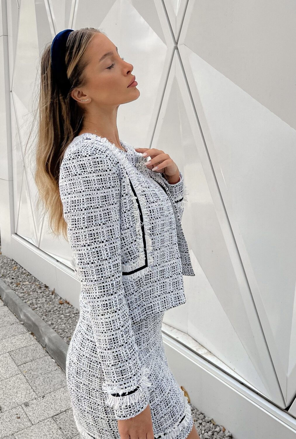 Дамско сако “KRISTA” изработено от памучно букле в тъмносиньо и бяло с ефектни елементи.