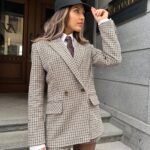Изработено от висококачествен вълнен плат с фин пепитен десен в бежово-кафява гама, сакото се отличава със структурирани рамене, класически ревер и свободно падаща форма.