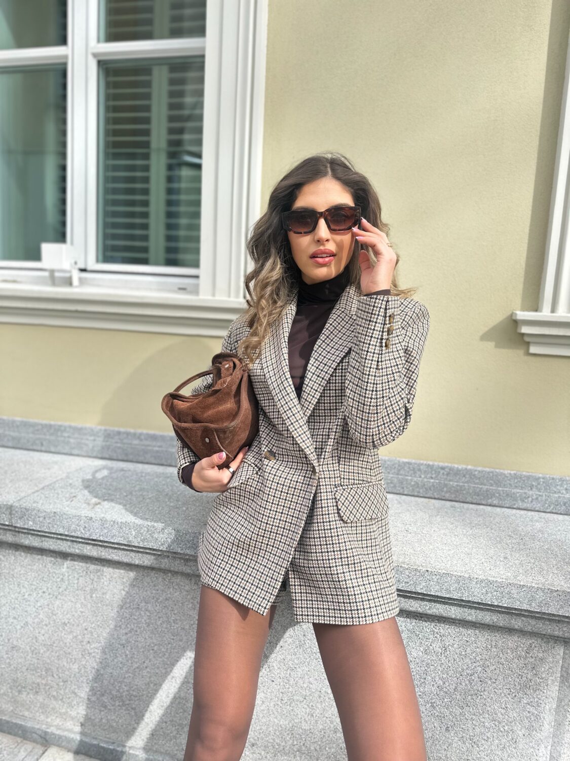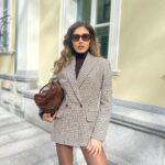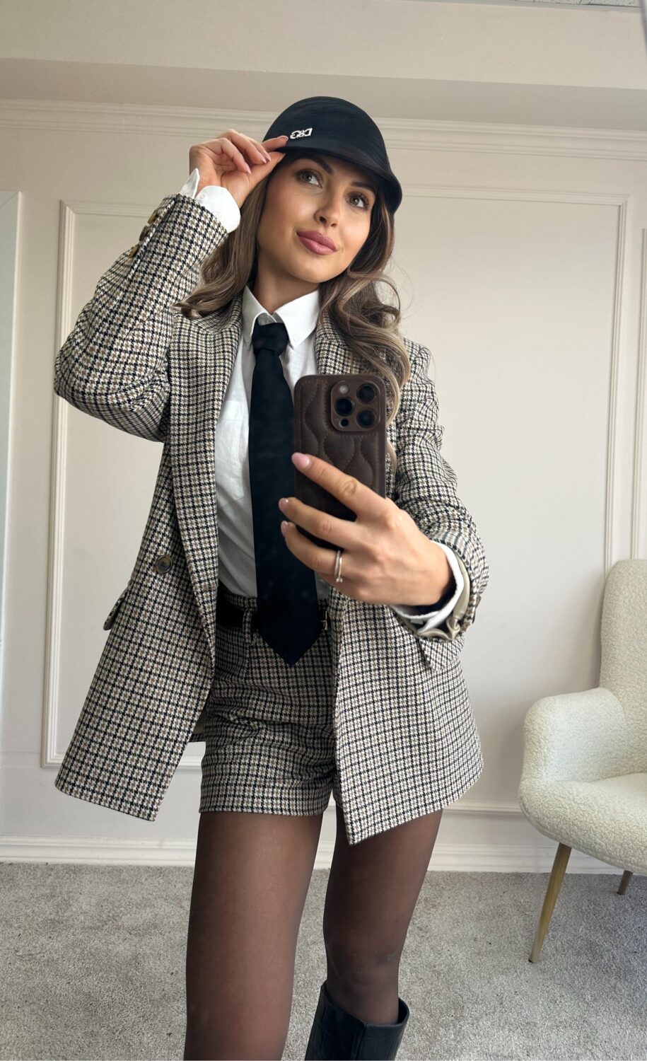 Изработено от висококачествен вълнен плат с фин пепитен десен в бежово-кафява гама, сакото се отличава със структурирани рамене, класически ревер и свободно падаща форма.