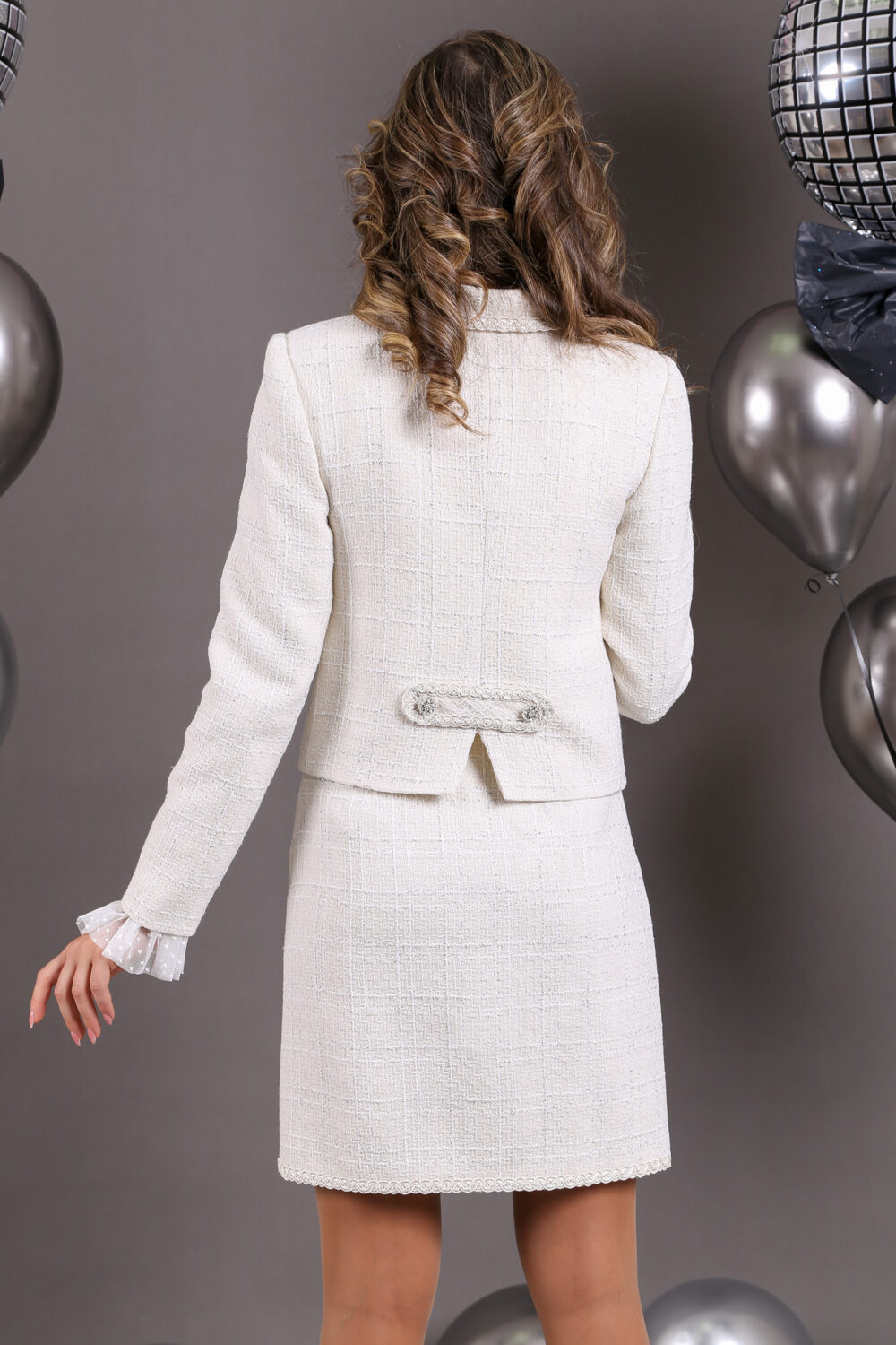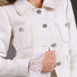 Елегантно сако, което впечатлява със своята грация и финес. Дизайнерът е заложил на ефектни орнаменти и кройка. Луксозно, италианско букле с деликатна ламе нишка.