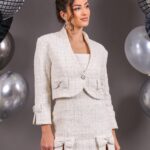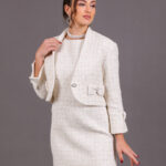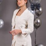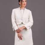 Сако – тип “болеро” изработено от италиански плат туид с лека ламе нишка в сребристо и малки, деликатни пайети