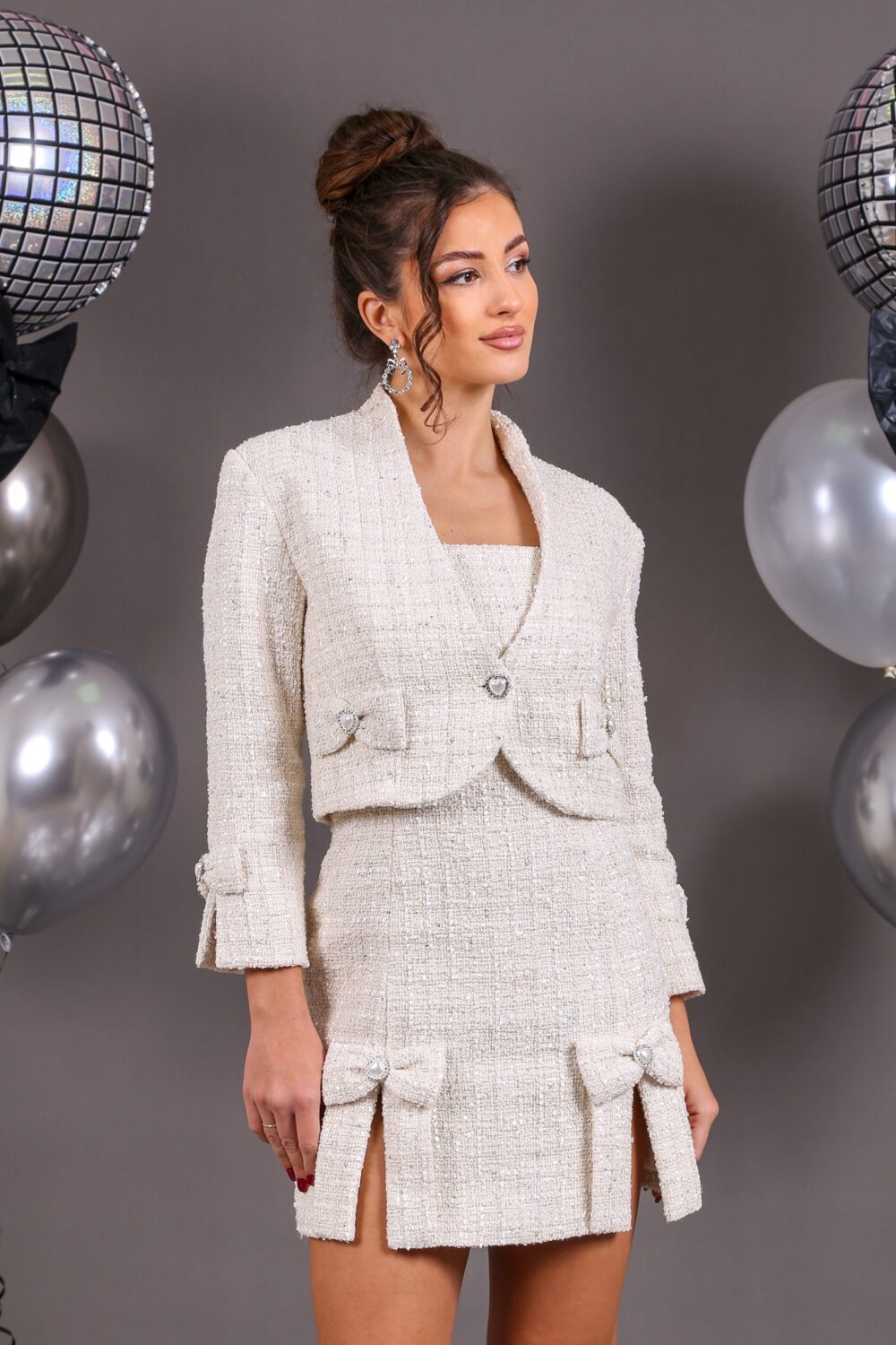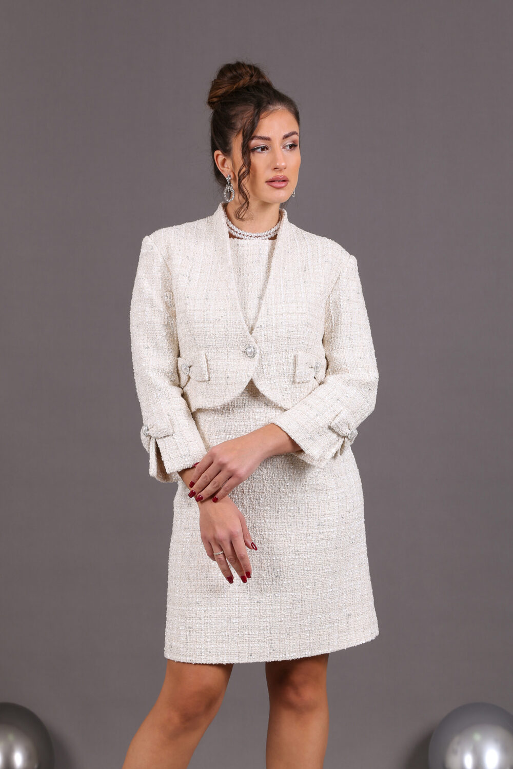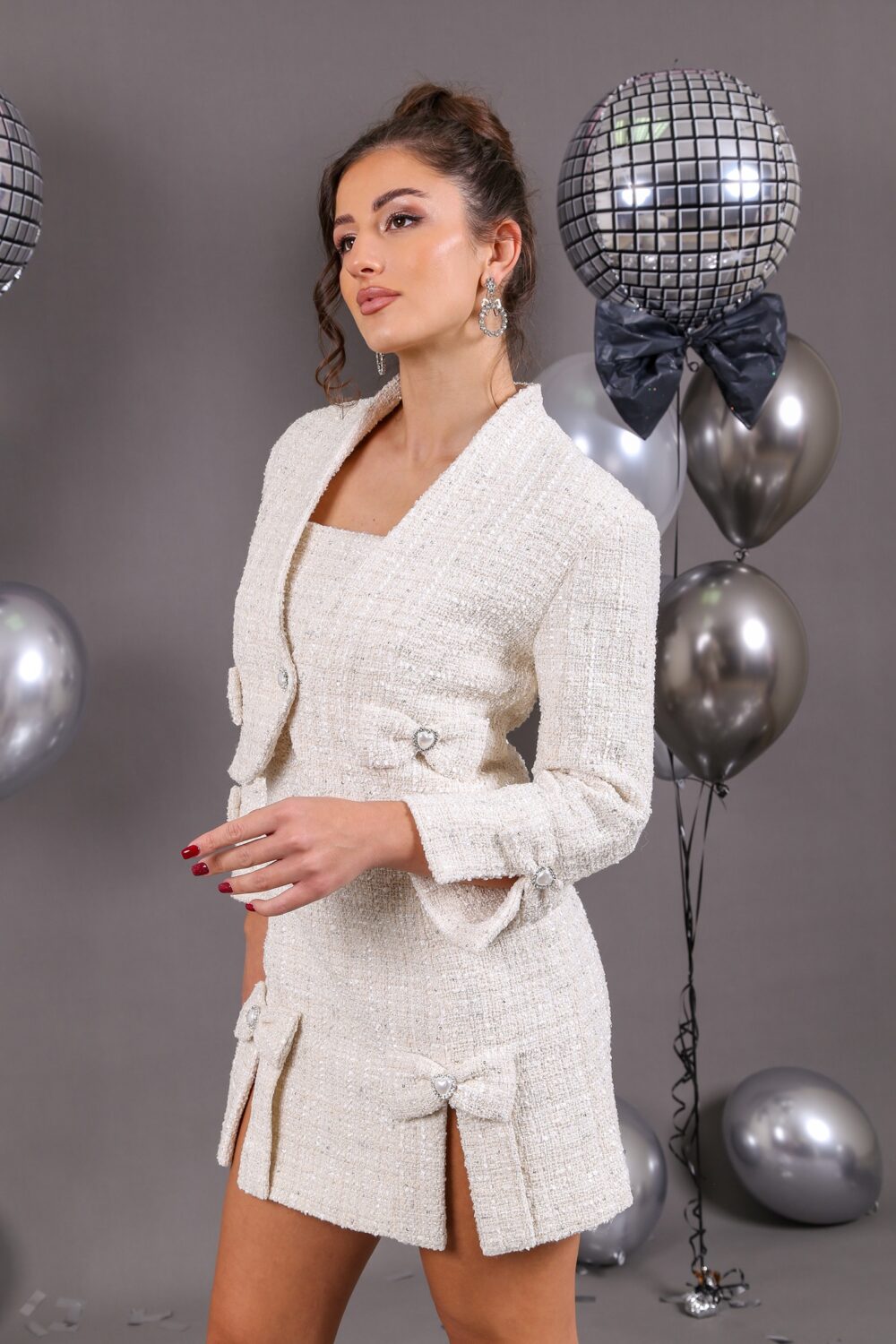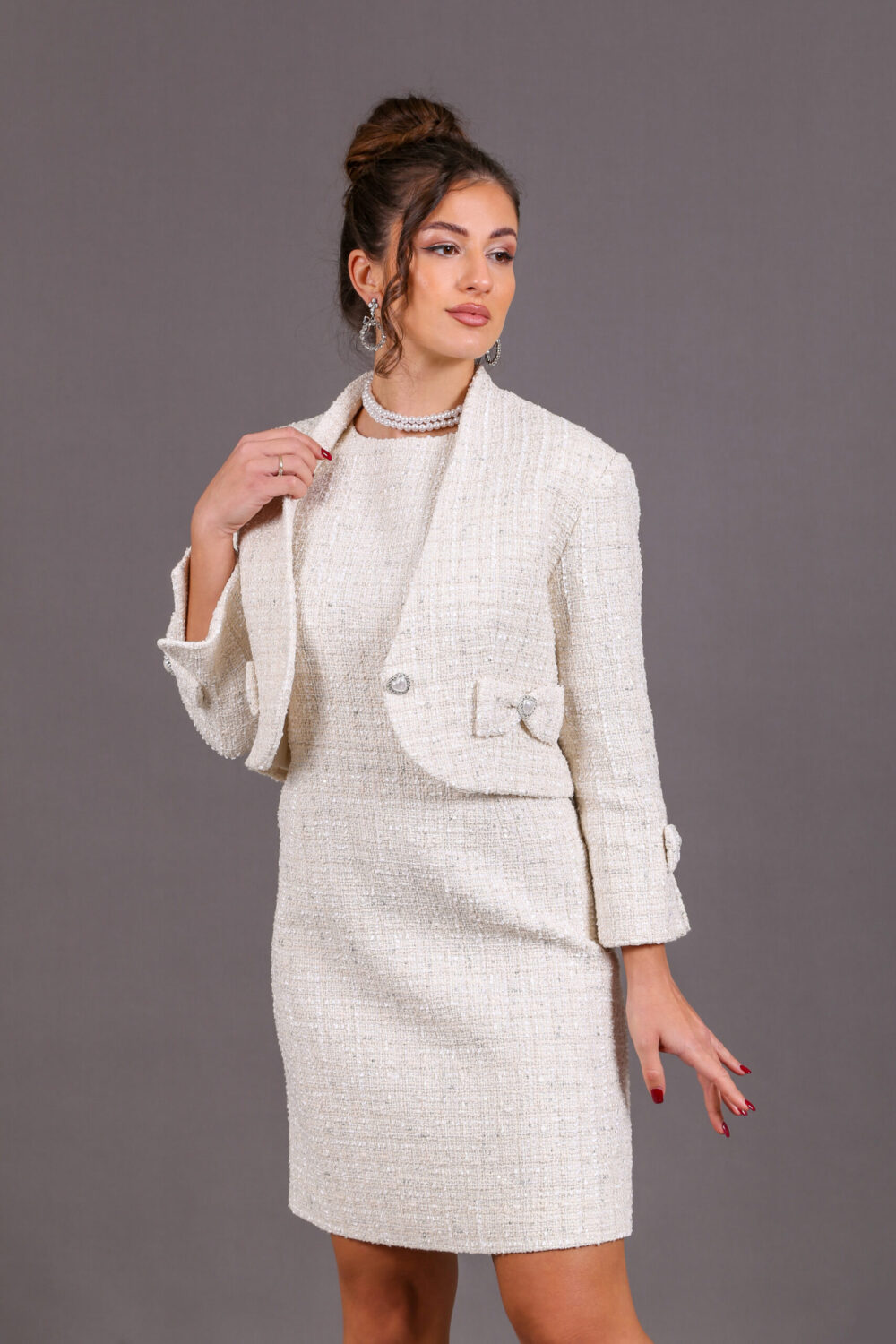 Сако – тип “болеро” изработено от италиански плат туид с лека ламе нишка в сребристо и малки, деликатни пайети